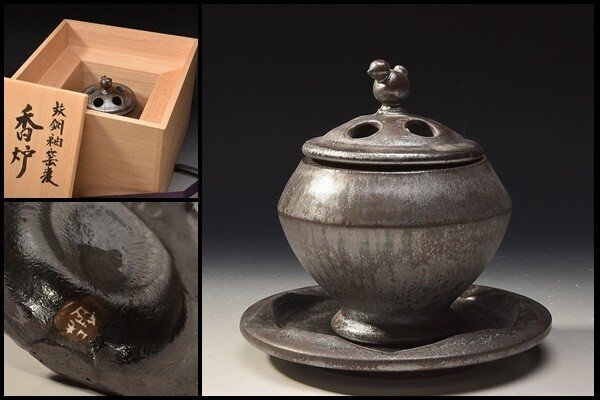 U07044 希少 木村盛和 鉄銅釉 窯変 香炉 香爐 共箱 天目 /桜