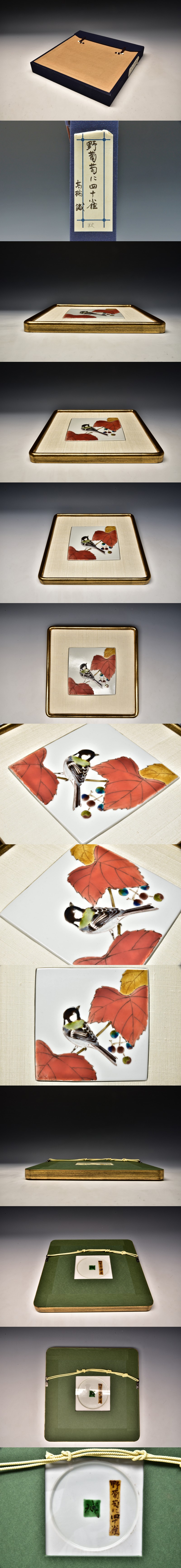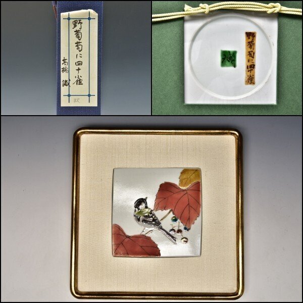 U08861 東京芸大 高橋誠 色絵磁器 陶額 野葡萄に四十雀 共箱 /G305