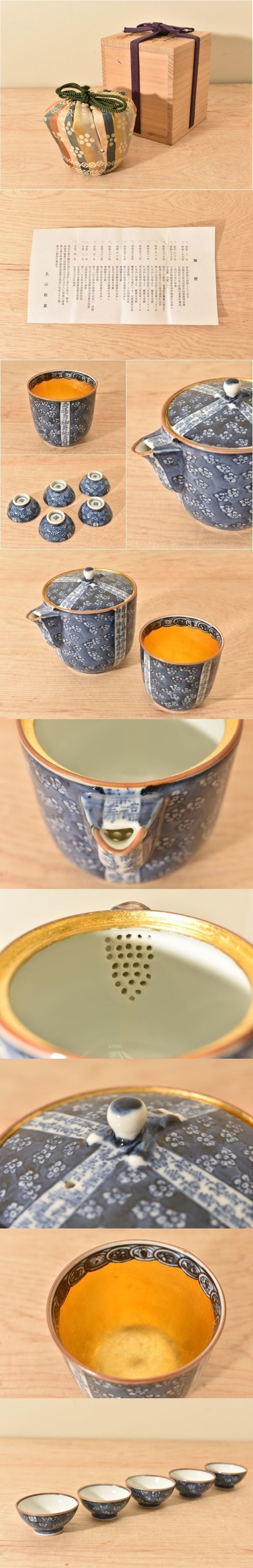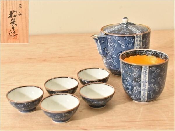 4895 平安 松泉 土山松泉 京焼 青華小梅福寿字文 寿福 組煎茶器揃 茶器 茶道具 煎茶 最上作 共箱 仕覆 /55A