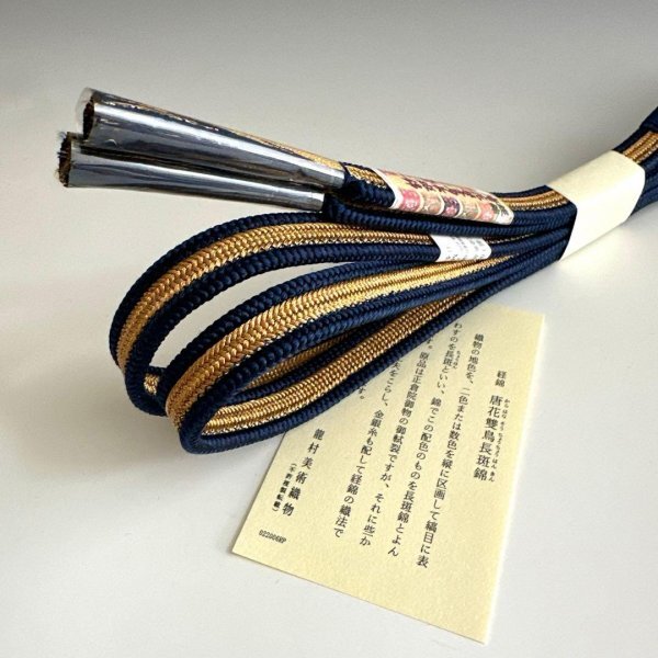正倉院文様や古典意匠を基にした格調あるデザインと、精緻な組み技術が特徴。美しく深みのある色彩と、立体感のある模様が着姿に華やぎを添えます。