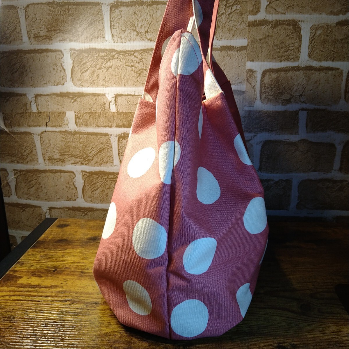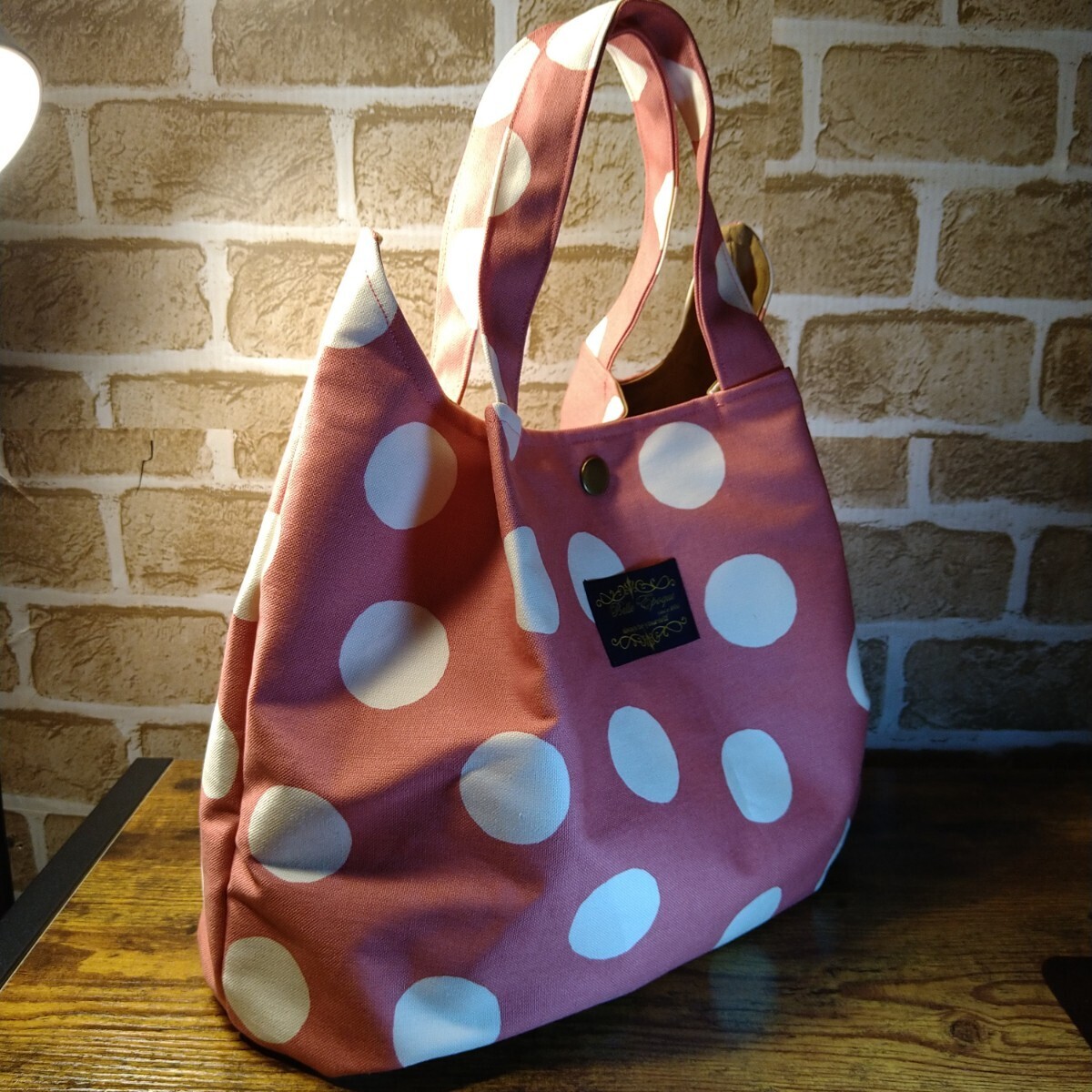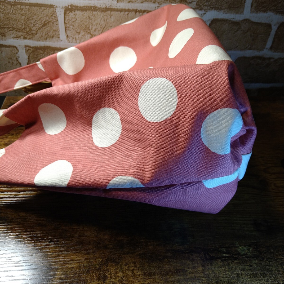 ☆表は濃いめくすみピンク色水玉柄の薄手帆布生地、裏地はシーチング生地を使用しています。