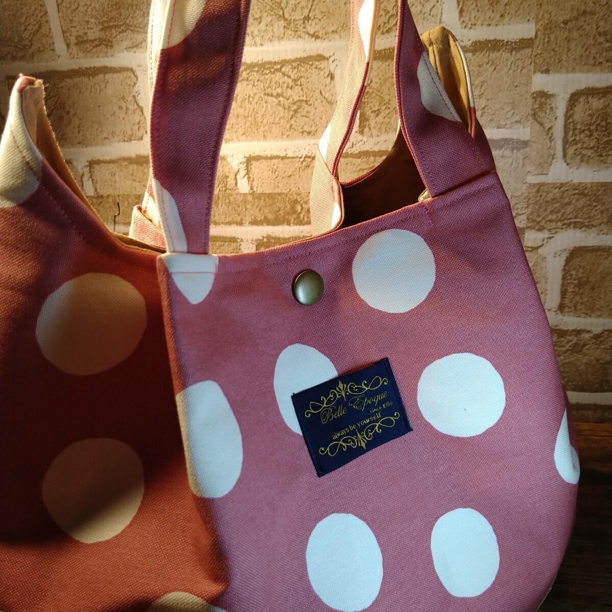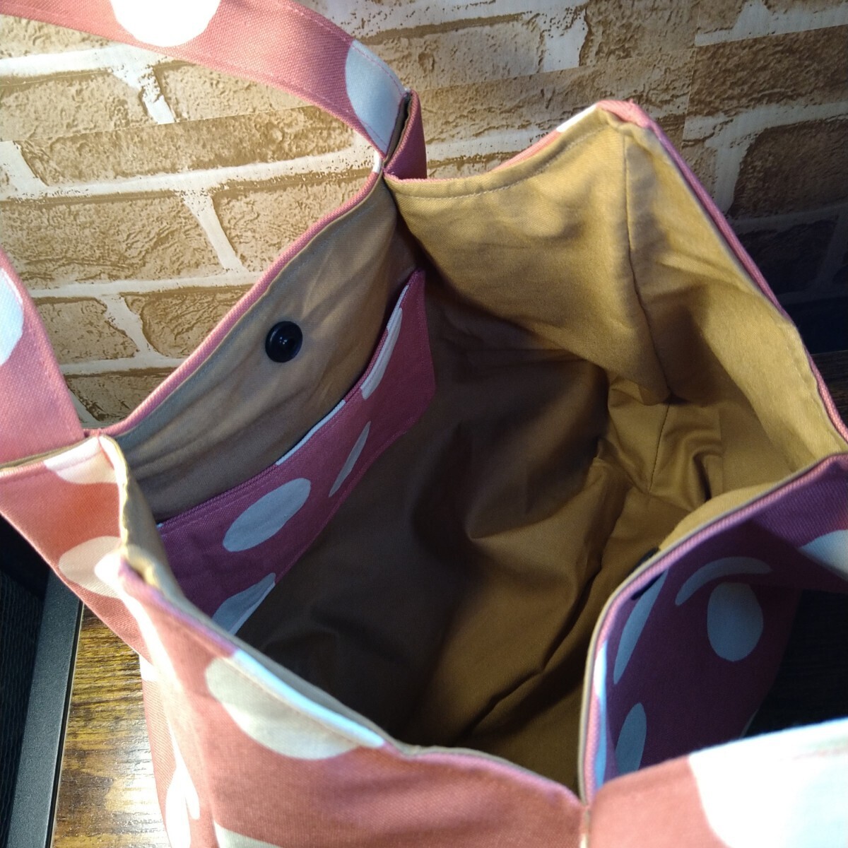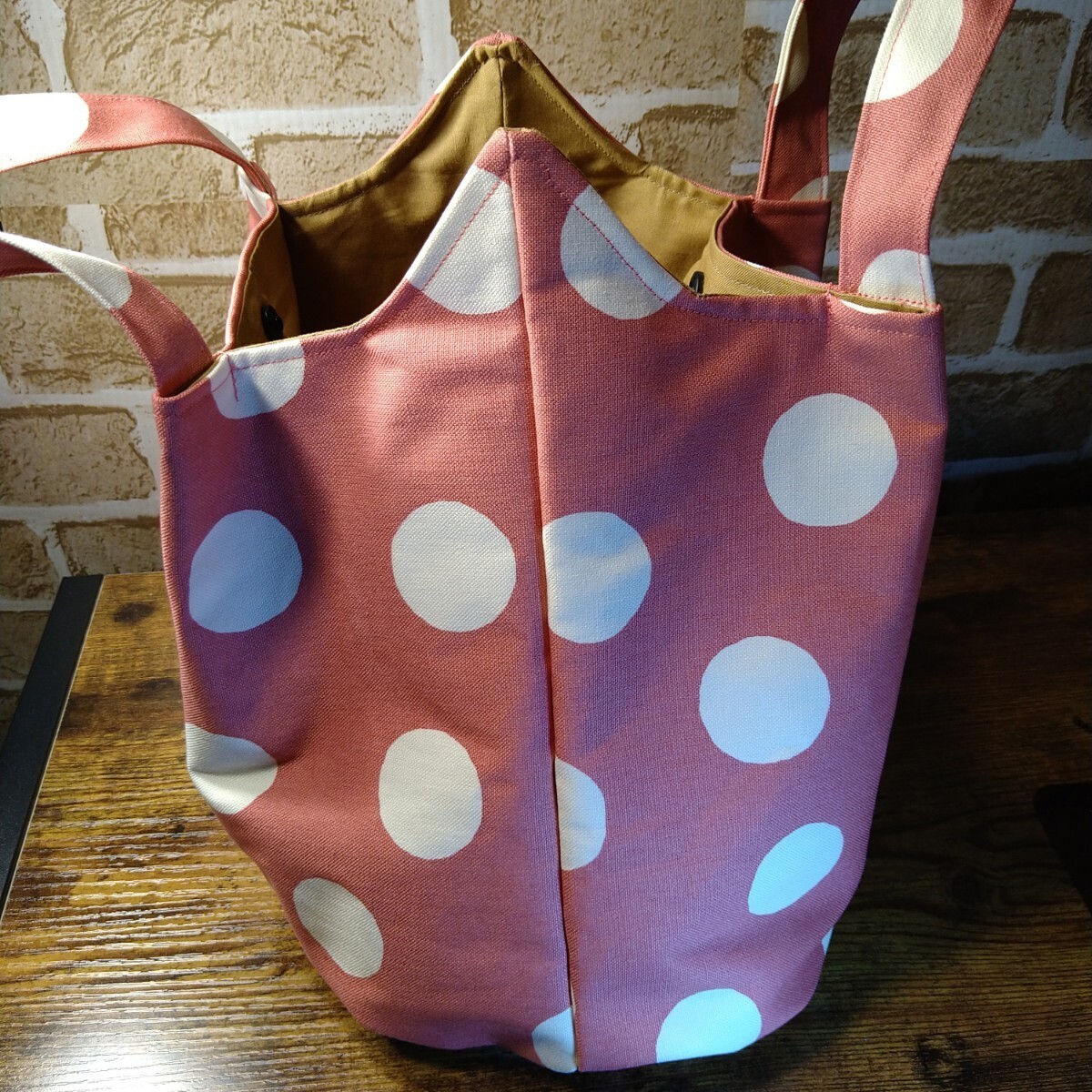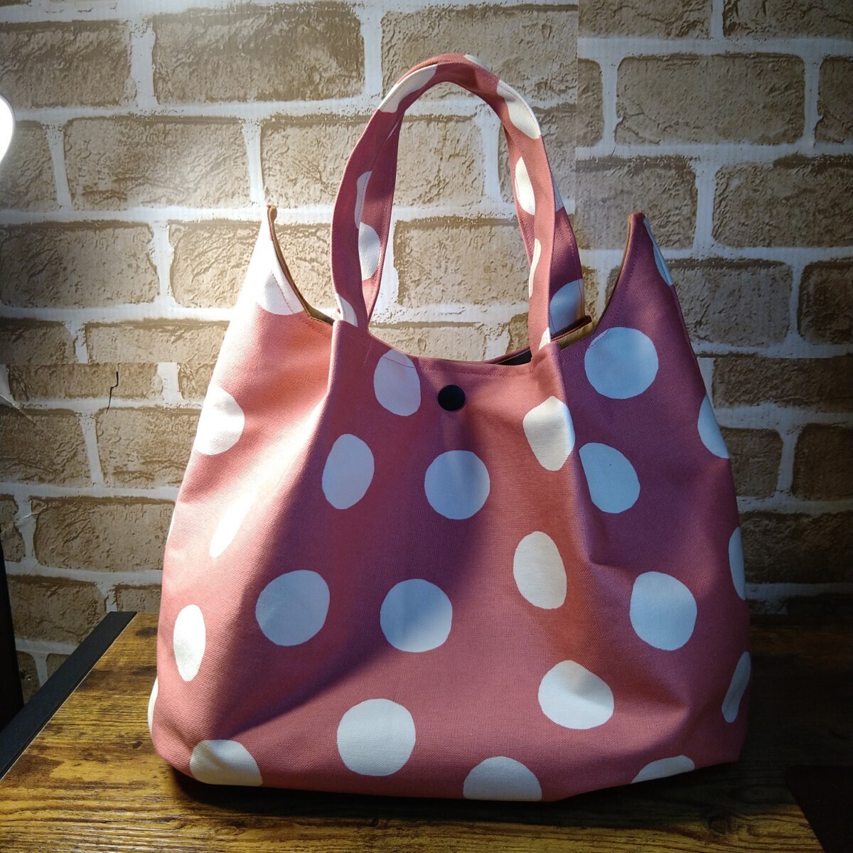 ☆表は濃いめくすみピンク色水玉柄の薄手帆布生地、裏地はシーチング生地を使用しています。