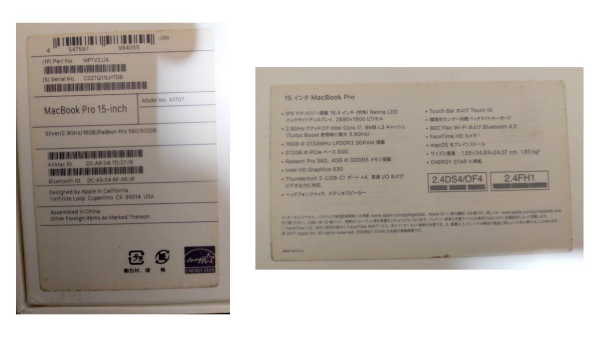 【ジャンク】【動作品】【送料無料】MacBookPro 2017 MPTV2J/A 15インチ スペースグレイ Intel Core i7(2.9GHz) SSD512GB メモリ16GB
