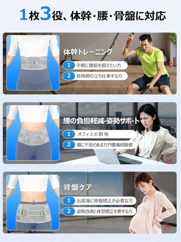 1枚3役・腰サポート/骨盤ケア/トレーニング腰椎コルセットは腰椎保護・骨盤固定・トレーニング補助という3大機能を兼ね備えたオールインワン腰痛ベルト。現代人に多い腰痛・骨盤の歪み・姿勢不良などの問題を包括的にアプローチします。一本で三役の機能性を実現。オフィスワーカー、産後の骨盤ケアが必要な方、トレーニング愛好家など多様なニーズに対応します。