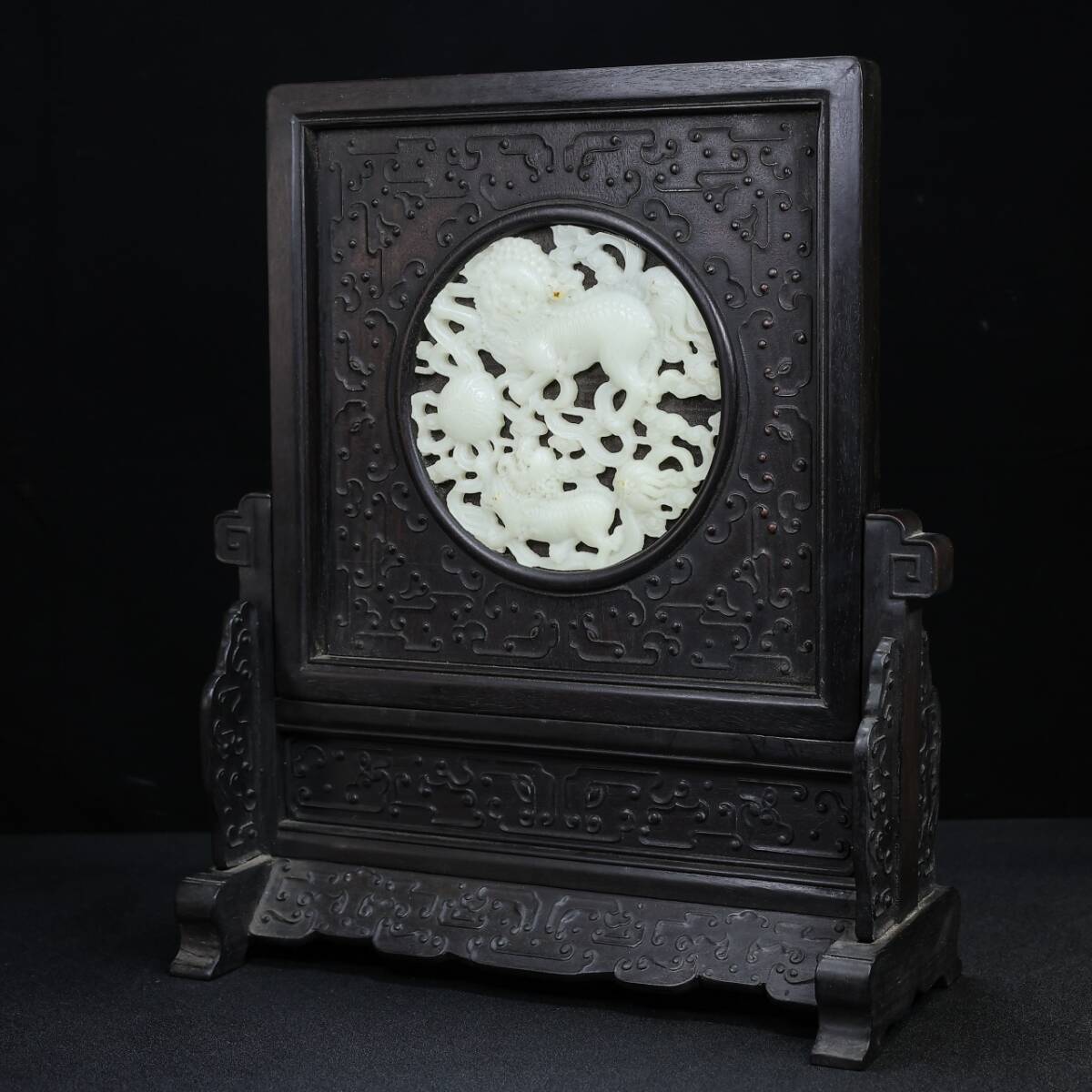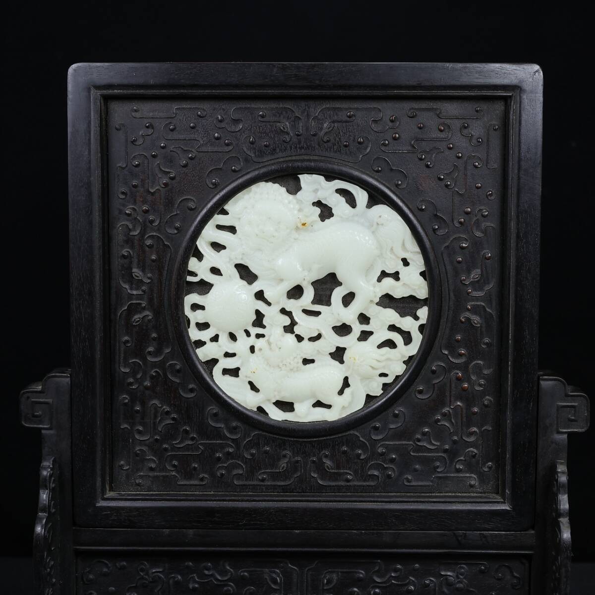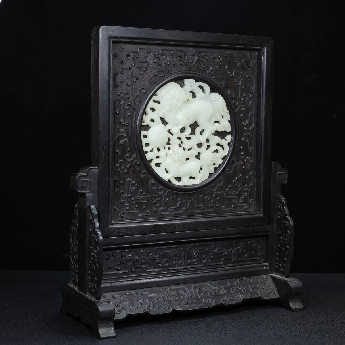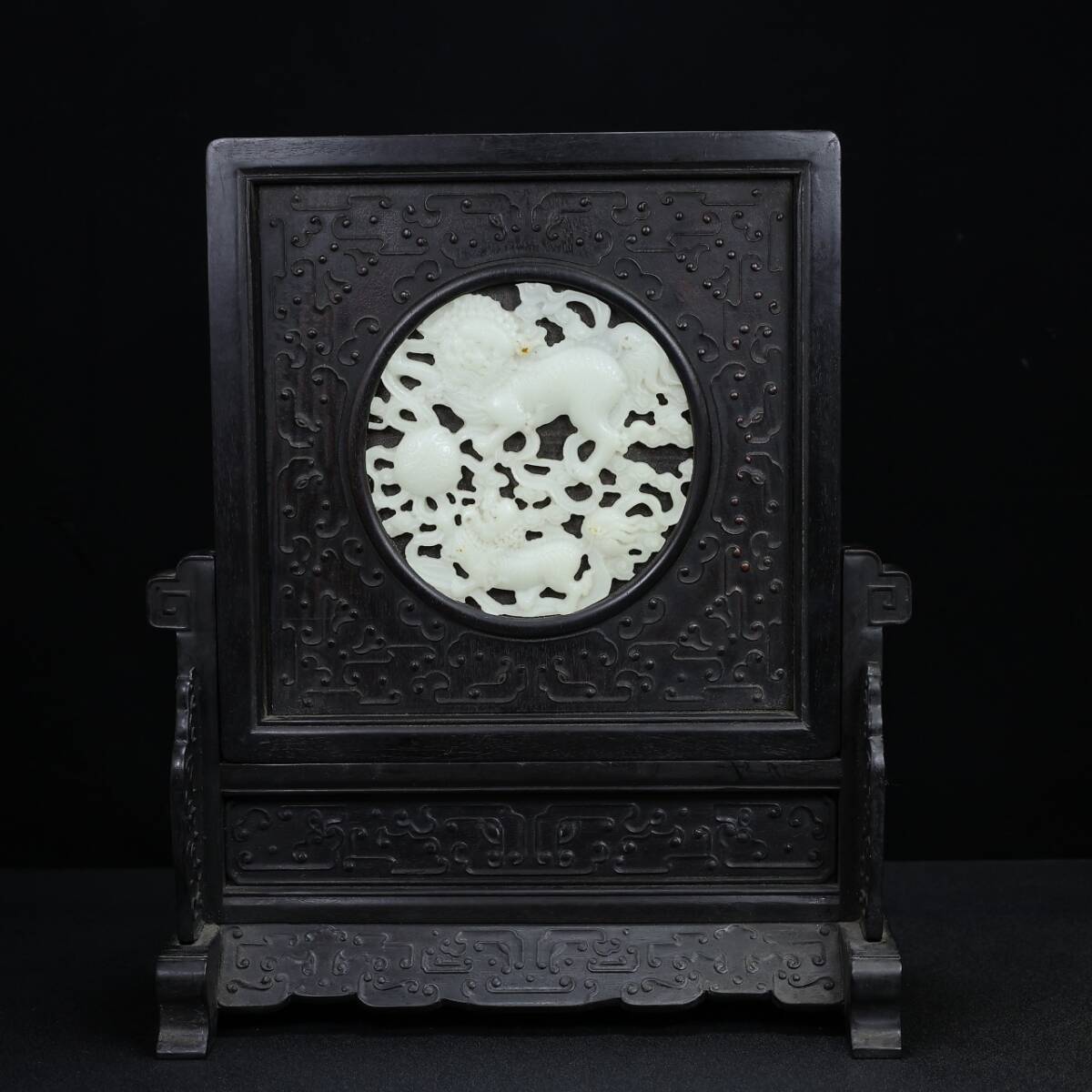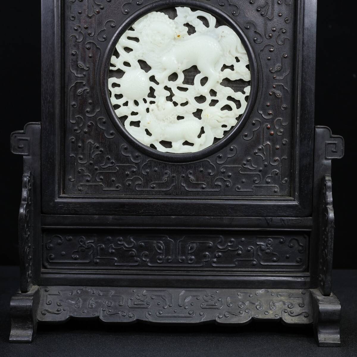 旧蔵 清 紫檀木 モザイク白玉 事事如意 屏風 置物 極細工 中国古玩 骨董品 古美味 212