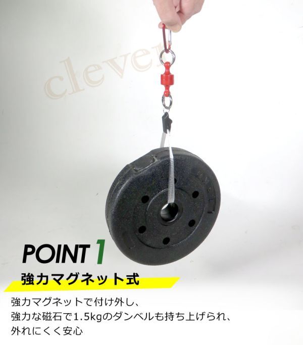 強力な磁石で1.5kgのダンベルも持ち上げられ、外れにくく安心