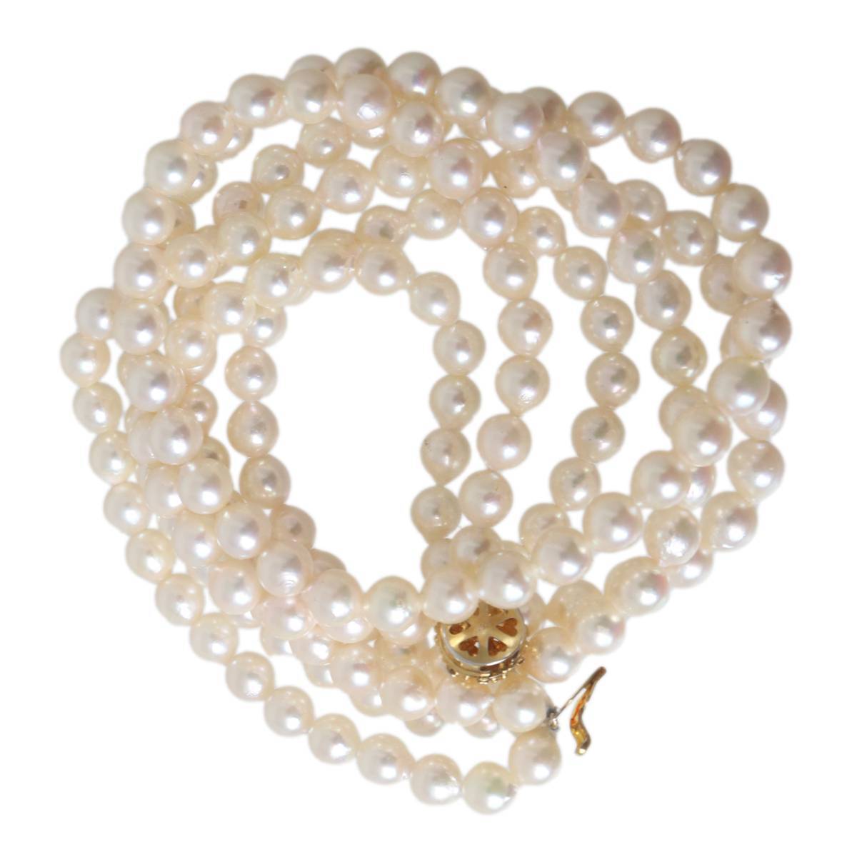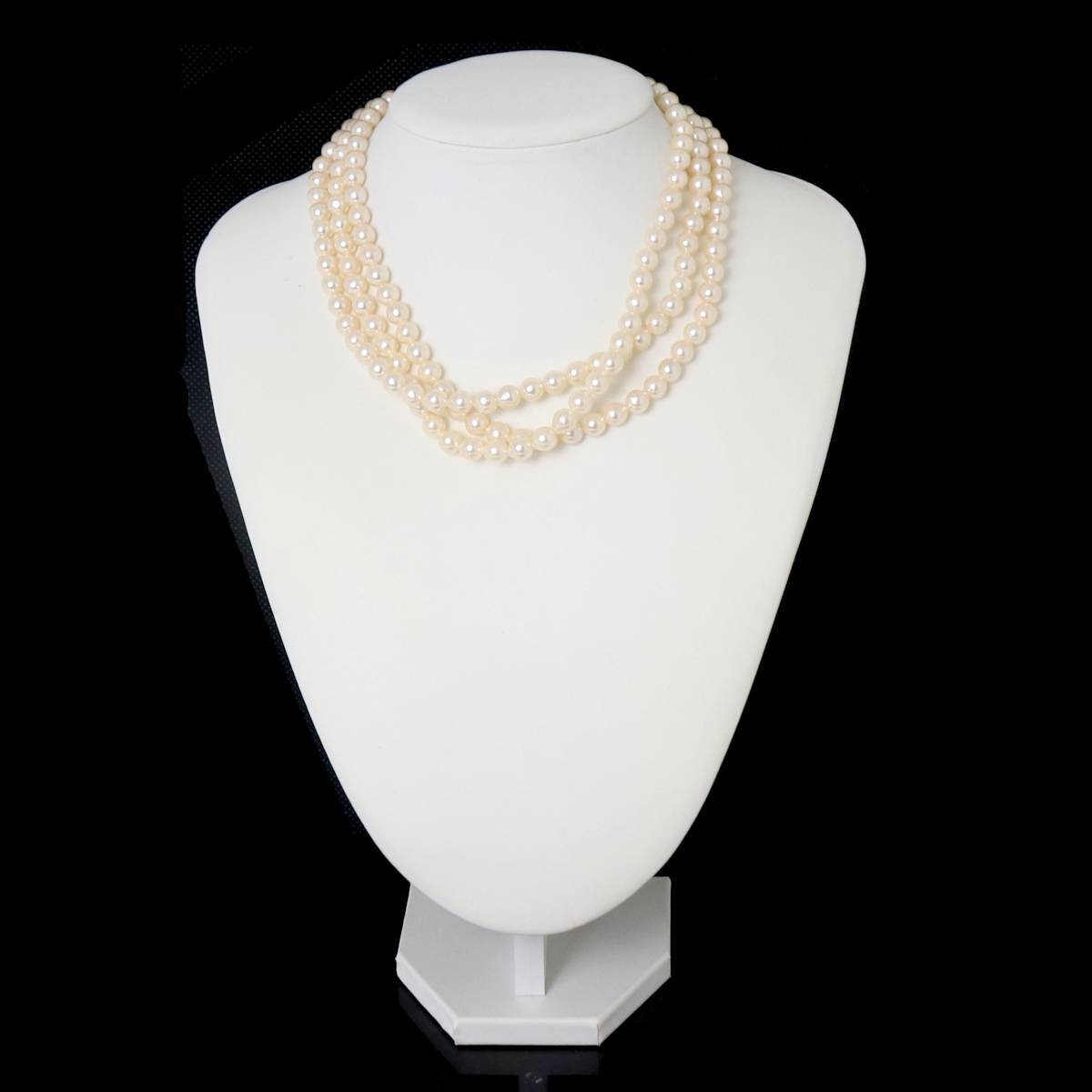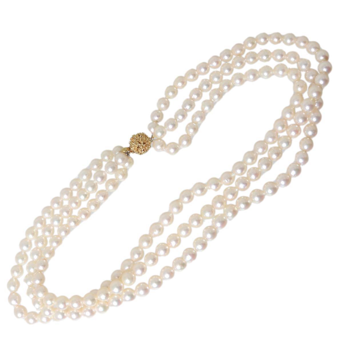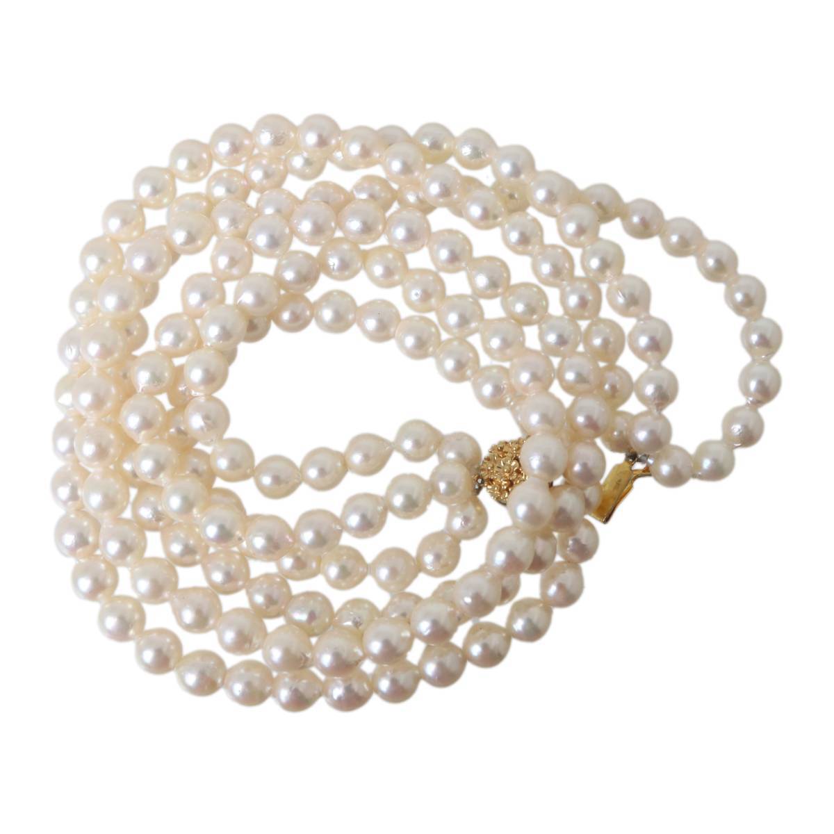 | 【担当より一言】 | 3連の本真珠を使用したネックレスです。ピンクベージュの優雅な色合いが特徴で、パールのサイズは6.6mmから6.9mmです。金具にはSv925を使用し、全体の重量は76.8gです。首回り約40cmのデザインは、フォーマルな場面でも日常使いでも活躍します。中古品ですが、Bランクの状態で、品質が保たれています。特別な日の装いに、上品な輝きを添える一品です。 |