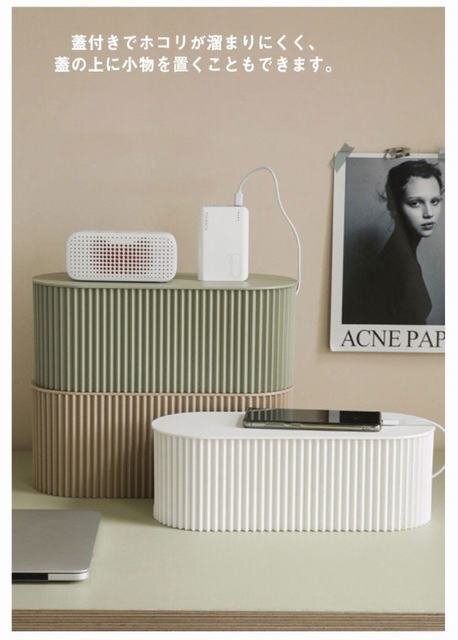 無駄のないシンプルなデザインで、部屋に馴染みます。 蓋付きでホコリが溜まりにくく、蓋の上に小物を置くこともできます。 シンプルながらスタイリッシュなケーブルボックス。 側面には通気口を施し、熱がこもりにくいように設計されています。