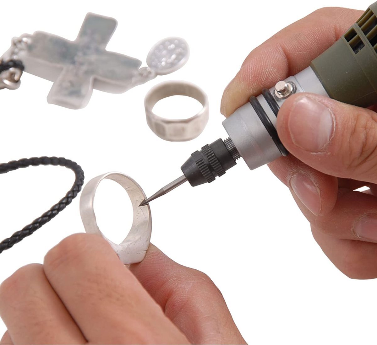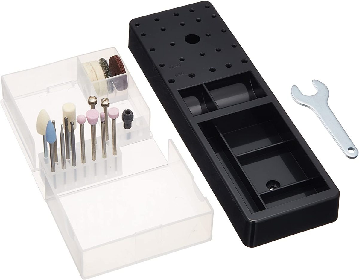 | 仕様・規格 | <仕様> ■電源:100V・50/60Hz ■消費電力:35W ■回転数:8000~18000min-1(回/分) 無段電子コントロール付 ■サイズ:長さ230×太さ径35mm ■重量:260g ■定格使用時間:15分 <付属品> ・ダイヤモンドビット2種 ・ハイスビット2種 ・純毛パフ(軸付)2種 ・純毛パフ(ディスク)2枚 ・軸付砥石(WA)4種 ・シリコンパフ1本 ・切断砥石5枚 ・ワイヤーブラシ(鉄)1枚 ・専用シャフト2本 ・コレットチャク2種(φ2.35/3.0mm) ・専用ビットケース1個 ・ツールスタンド1個 ・スパナ1本 |