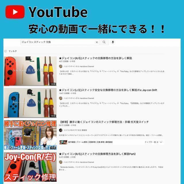 スティック交換の操作動画はYouTubeに「ジョイコン修理」で検索するのをおすすめします。
