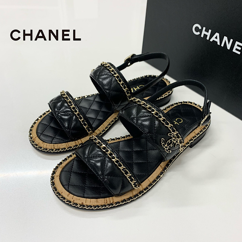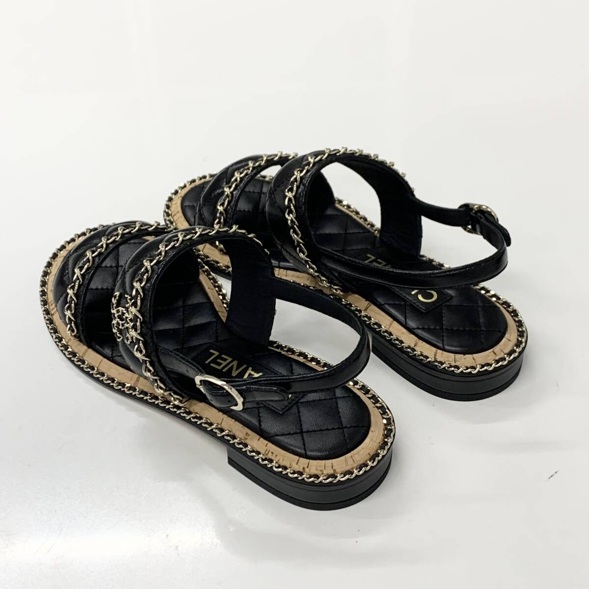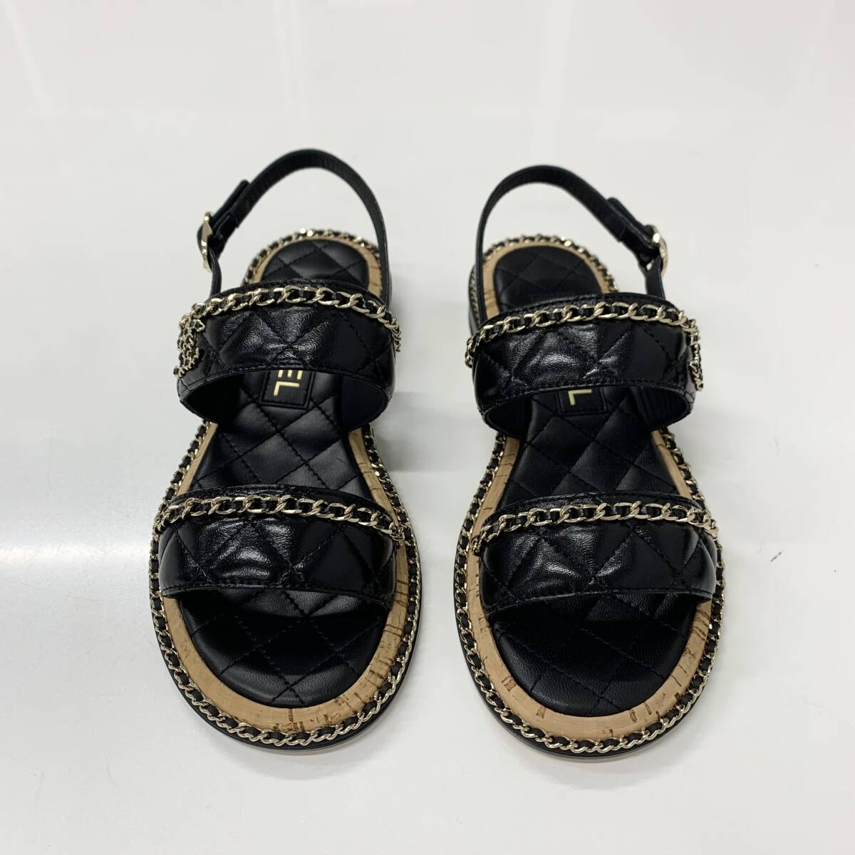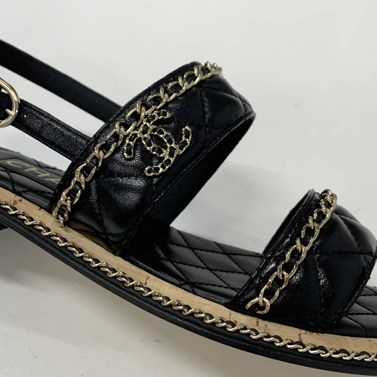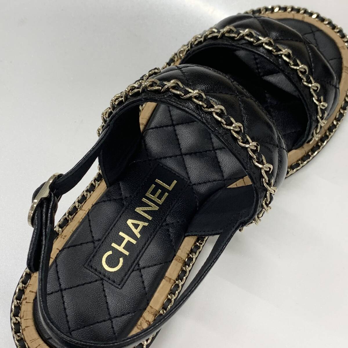 M13395 未使用 シャネル ココマーク マトラッセ チェーン レザー コルク サンダル ブラック