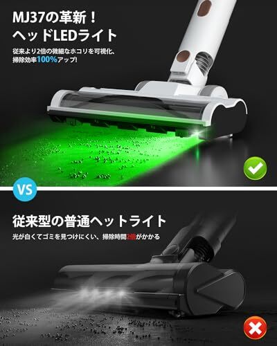 【業界初!グリーンLEDライト搭載!光らせて、見逃さない!】掃除機「MJ37」は市場の従来型と比べて、人間の目には最も比視感度に近い高輝度緑色光ライトを搭載して、見えないホコリを可視化!視認性が抜群で、暗い部屋でも微小ゴミは見やすくなりました!正確に照射角度を調整した光が、明るくても目に見えないホコリを浮かび上がらせて、吸い取ります。そして、自立式デザインのコードレス掃除機として、面倒なコード収納から解放できるのはもちろん、スタンドを収納したり、余計なスペースを取ったり、壁に穴を開けたりする必要なし、掃除の途中で手を離しても安心です。11段階の伸縮可能パイプを採用しており、身長合わせてパイプが調整できます。パイプの部分は45から69センチまで伸ばせるので、高い所もスイスイ掃除できます。それで、重さもわずか1.1kg!(本体重量)、片手でも自由に使えます。スイッチの押し続きが必要なし、指に負担がかかりません。毎日のお掃除がぐっと簡単になります。