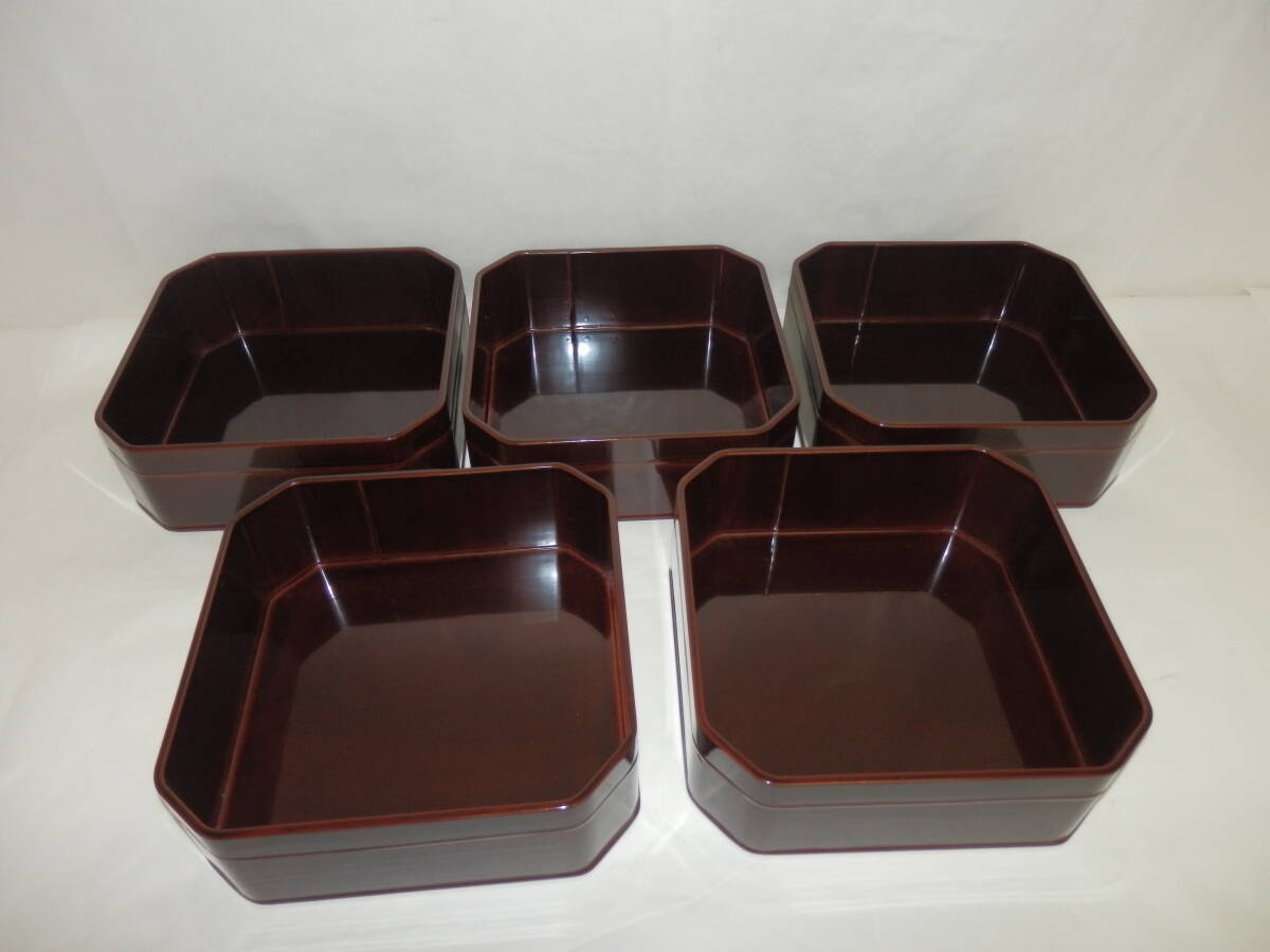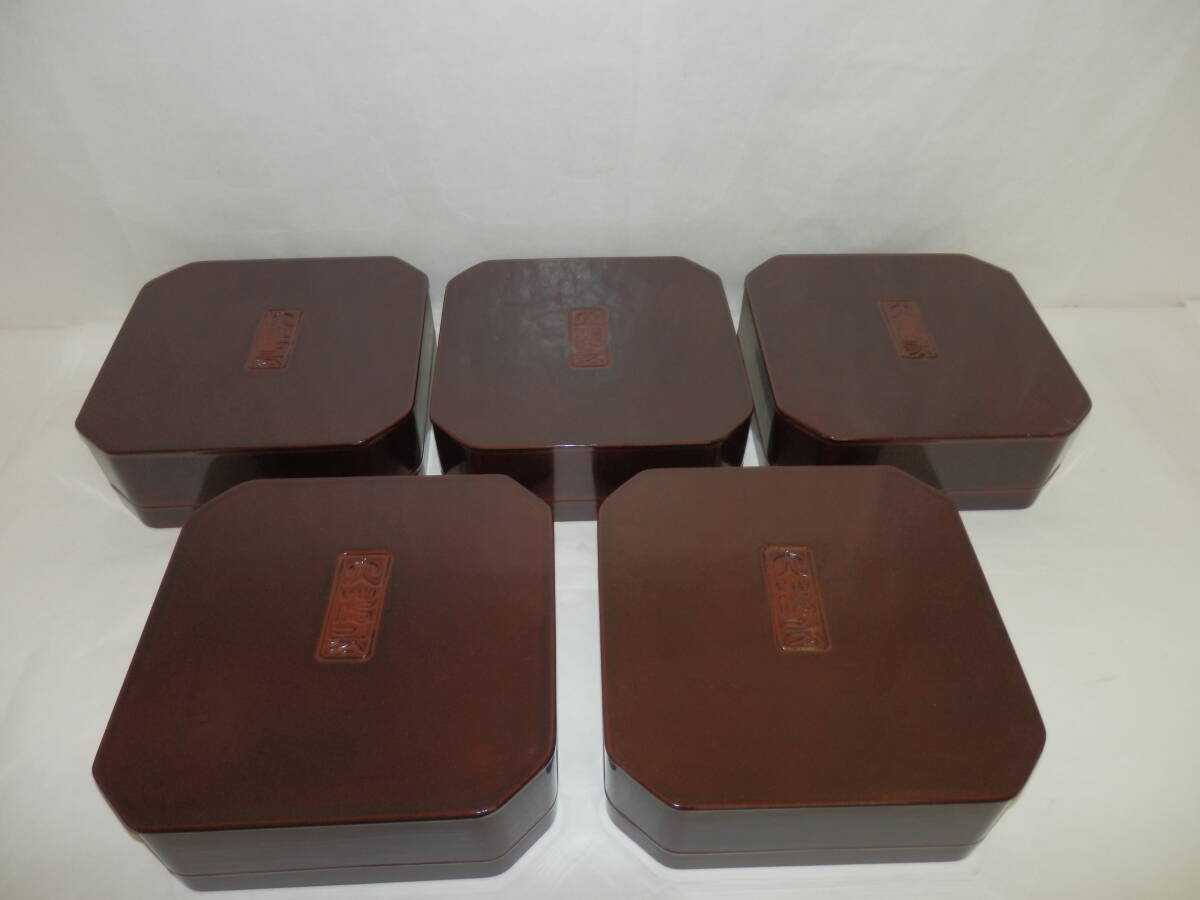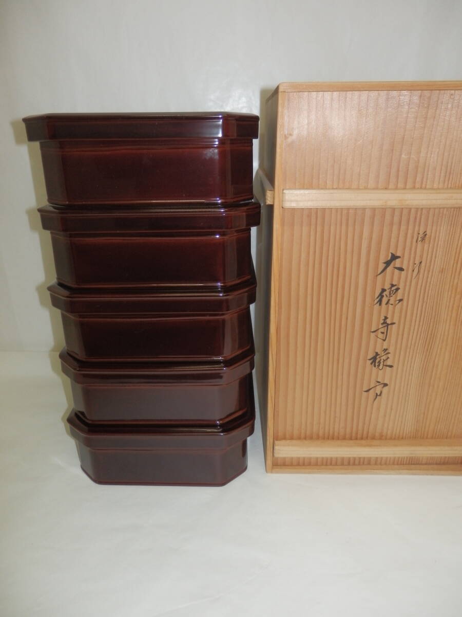 「中古品・茶道具」平安塗師の川瀬表完さんの溜塗の大徳寺縁高{弁当箱}です。五客です。約23cm四方 高さ約8.5cm 共箱「ヤケ、シミ等有」。 どうぞ宜しく。 『大徳寺の什器を写してつくられた器物。縁高は、角切、かぶせ蓋の一客宛のもので、寸法は大小あり、蓋の四辺には切り込みがあり、底に大徳寺の印が押してあります。』