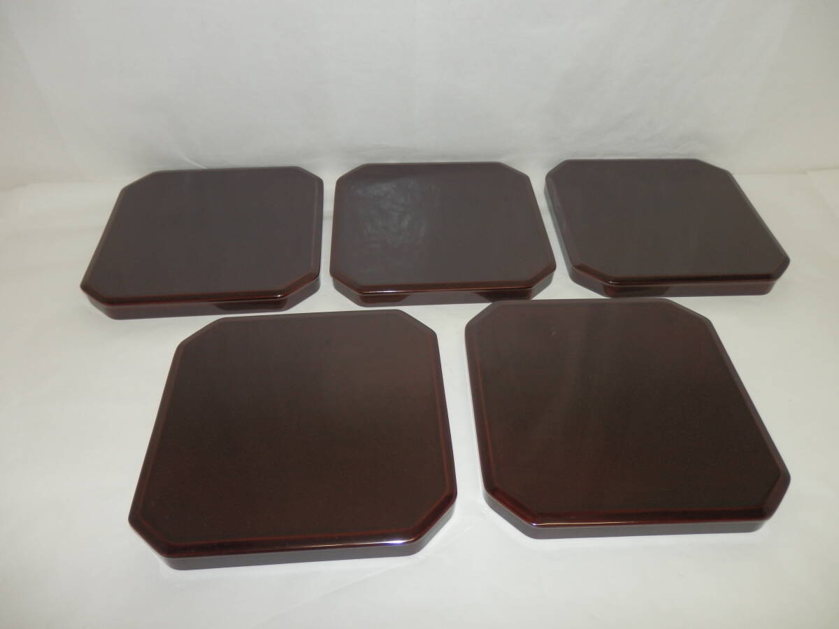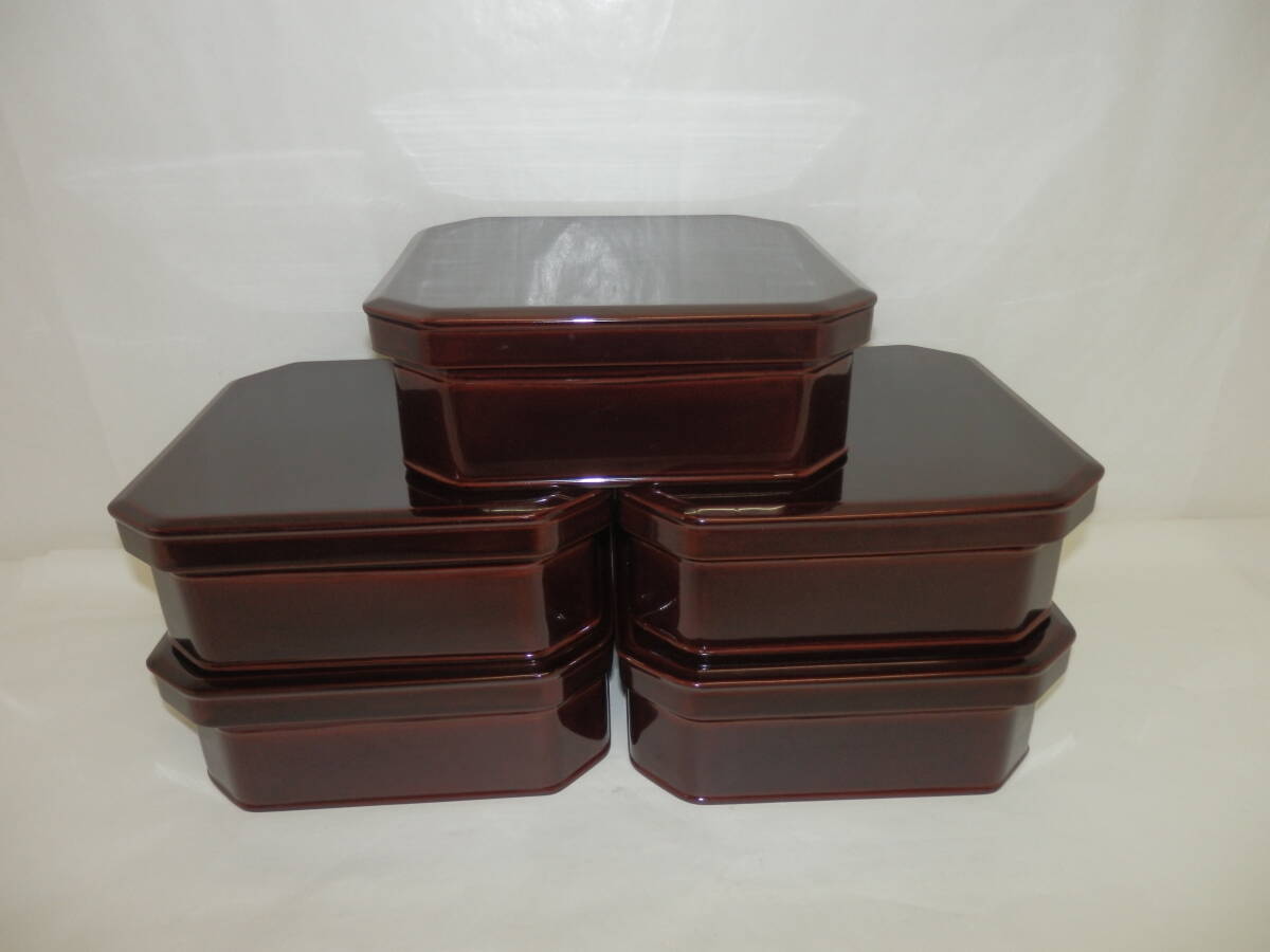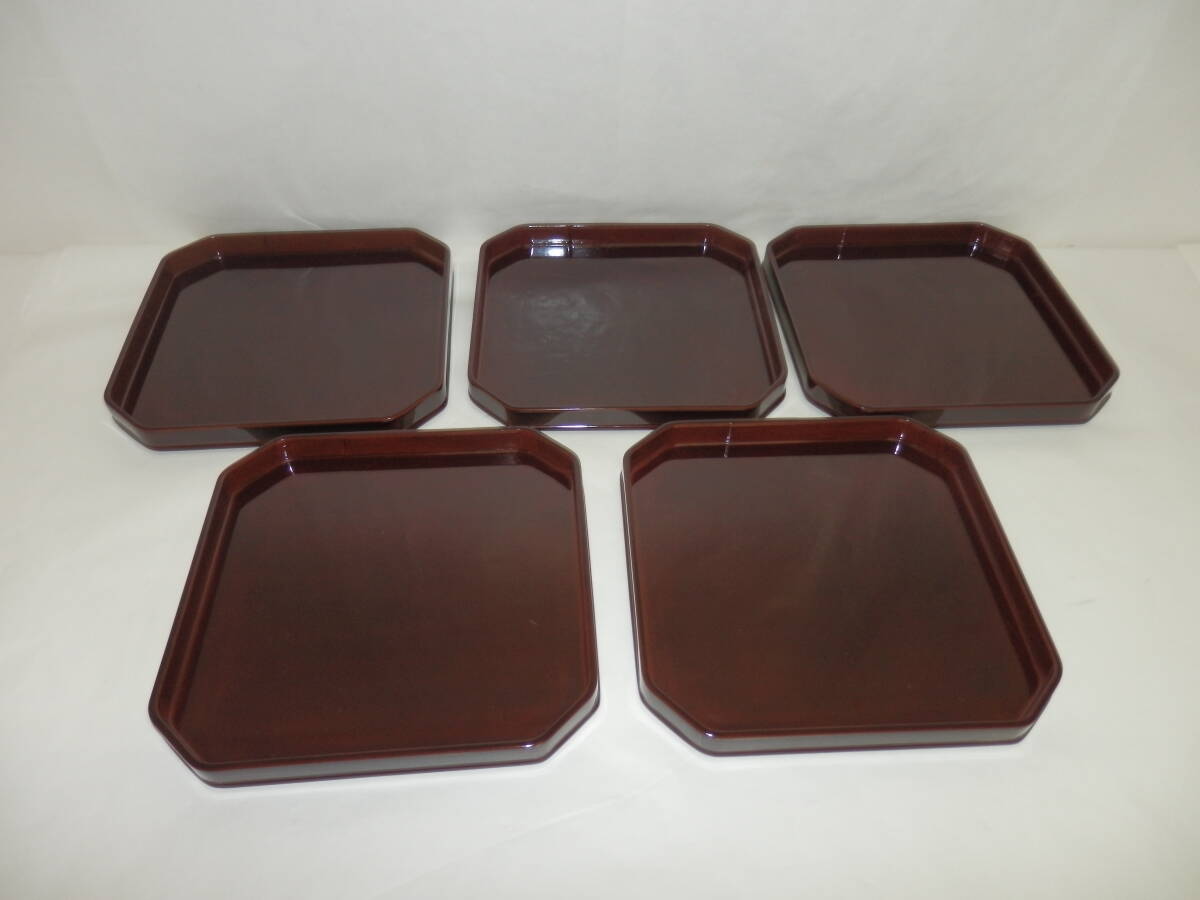 「中古品・茶道具」平安塗師の川瀬表完さんの溜塗の大徳寺縁高{弁当箱}です。五客です。約23cm四方 高さ約8.5cm 共箱「ヤケ、シミ等有」。 どうぞ宜しく。 『大徳寺の什器を写してつくられた器物。縁高は、角切、かぶせ蓋の一客宛のもので、寸法は大小あり、蓋の四辺には切り込みがあり、底に大徳寺の印が押してあります。』