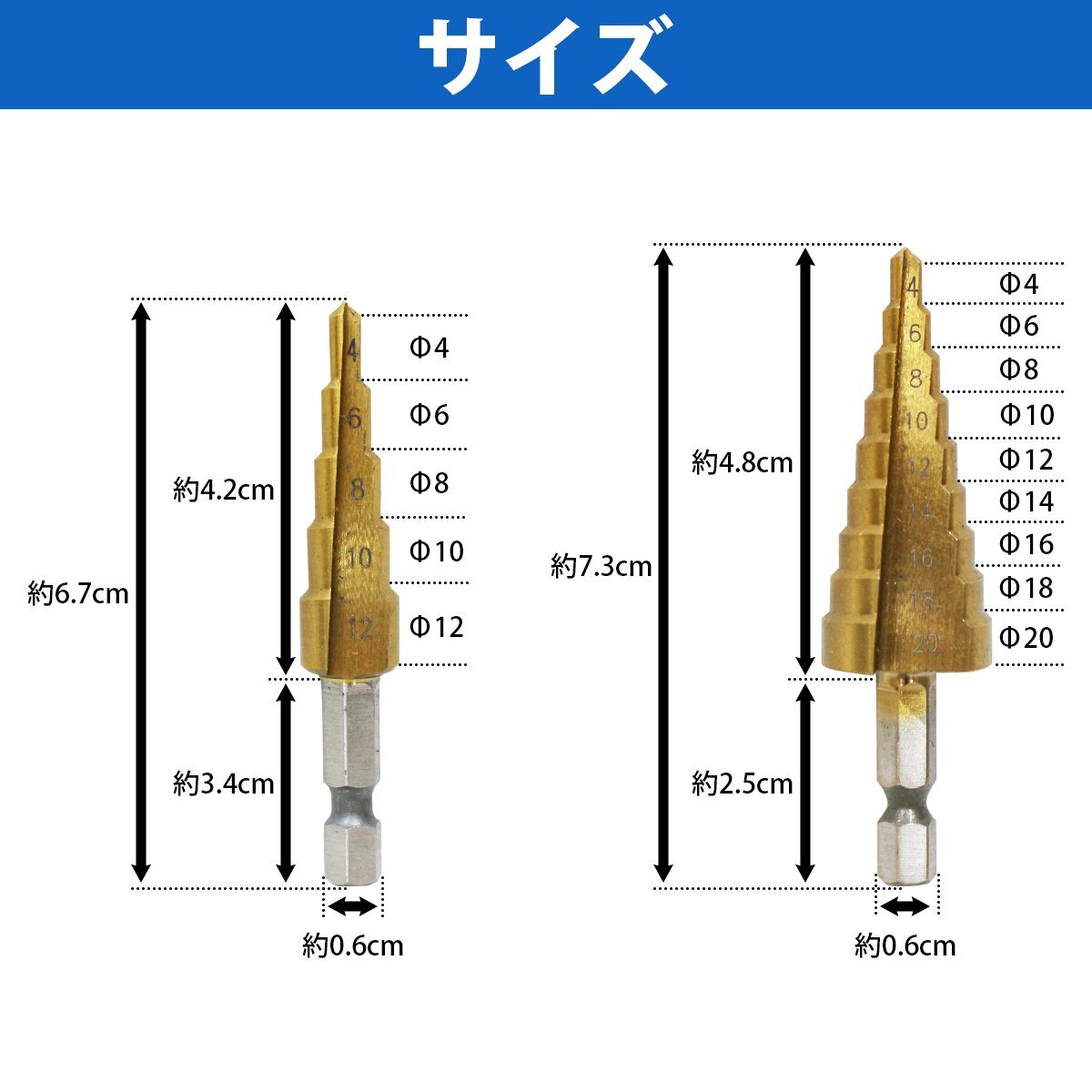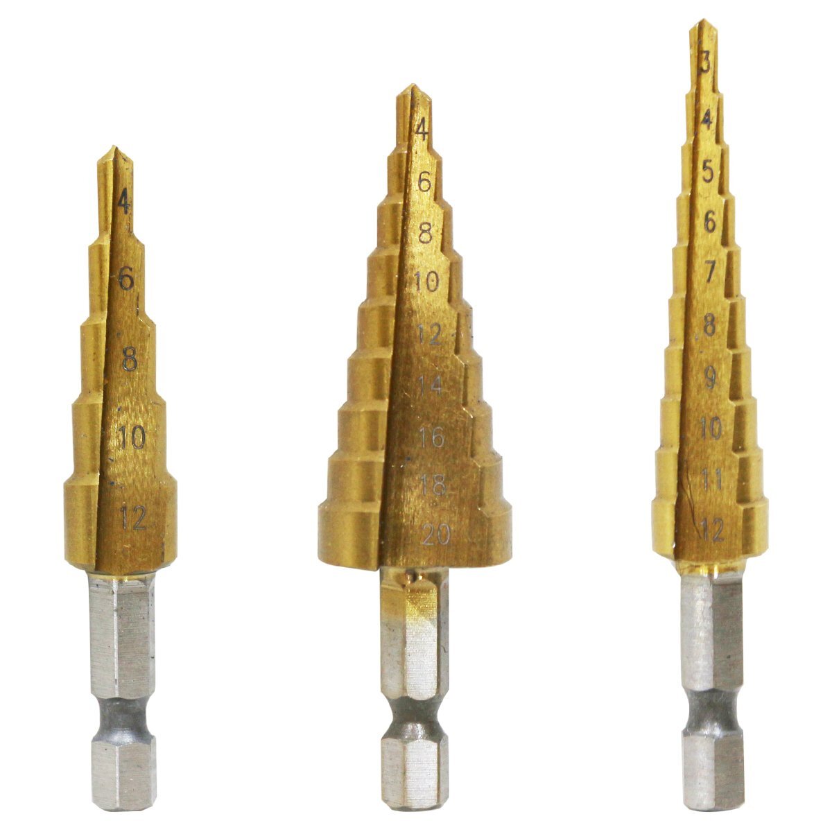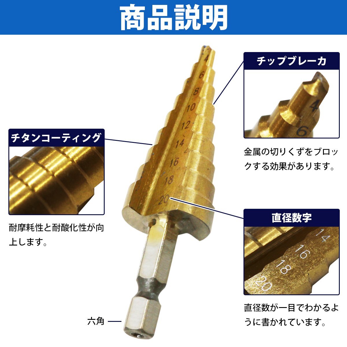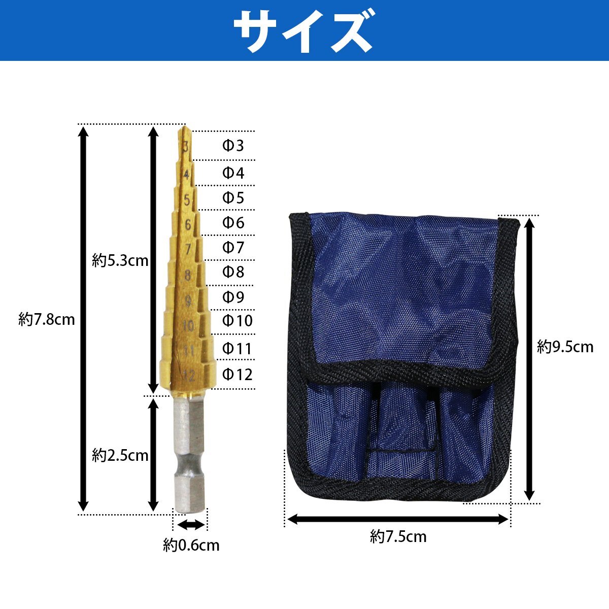 【送料無料】ステップドリル 3本セット タケノコ 六角軸 ドリルビット チタンコーティング ドリル 替え刃 予備 交換 収納ポーチ付