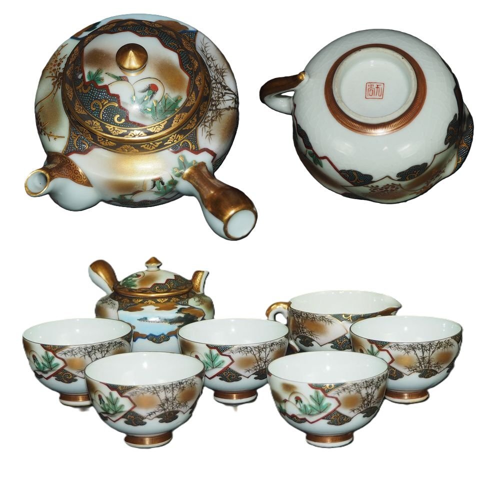 | 商品説明 | 急須 高さ約 8cm 胴径約 8.5cm 幅約 12.3cm 湯冷まし 高さ約 4.3cm 幅約 10×7.5cm 茶碗 高さ約 4.8cm 口径約 7.5cm ご覧のように、時代九谷焼上品茶器揃え7点セットです。質が高い、上品さが感じる逸品です。状態はとてもよい、完品無傷です、詳しくは写真でご確認ください。 |