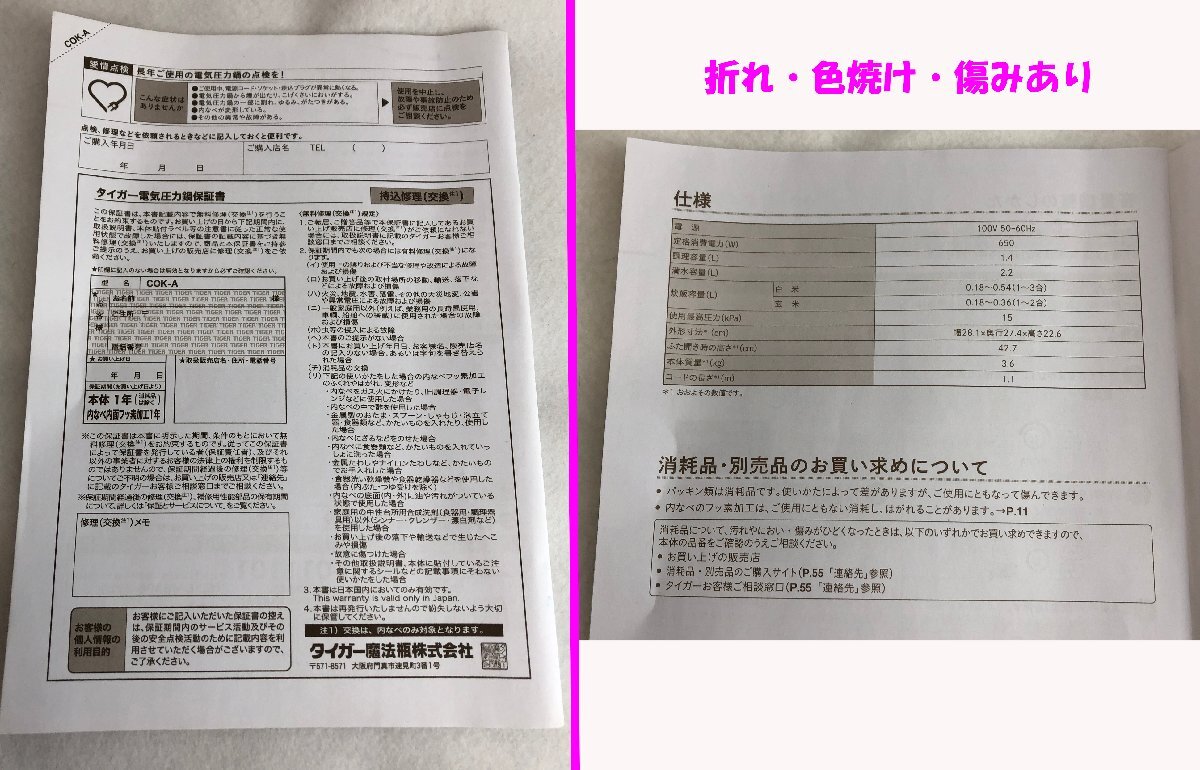 | 商品説明 | 電気圧力鍋 TIGER COOKPO COK-A220 TIGER (32325110217448C) *中古品です。 *23年製 *通電確認できました。 *型番:COK-A220 *メーカー:TIGER *保証書は未記入です。リユース品の為、弊社で捺印することはございません。 *本体にキズ・汚れがあります。 *掲載画像に写っているものが、出品物のすべてです。 |