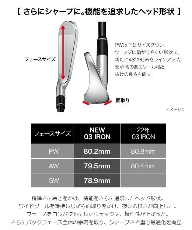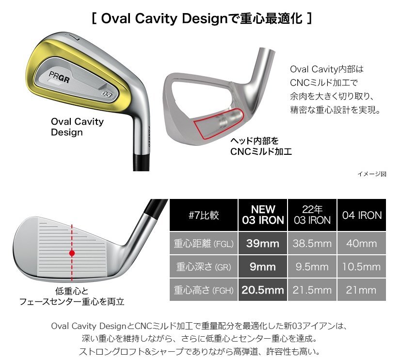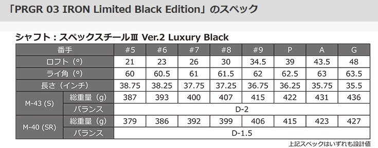 | 数量限定 Limited Black Edition ブラッククロムメッキ加工※ 「Limited Black Edition」はそれぞれのクラブ性能はそのままに、ヘッドはブラッククロムメッキで光の反射を抑え、よりショットに集中できるように仕上げたほか、シャフトもブラッククロムメッキ仕様の日本シャフト社製「Luxury Black(ラグジュアリー・ブラック)仕上げ」を採用。レギュラーモデルより力強さを感じられる精悍な見た目を纏った特別仕様のクラブとなっています。 ただ飛ばすだけでは、PRGRアイアンとは呼べない。その先のターゲットへ、高弾道で狙え。 恐るべき飛距離、群を抜く美しさ。03 IRONが、さらに進化して、生まれ変わった。ひとつひとつの機能、形状、精度を高めながら、驚くべき飛距離、目を奪われる機能美に磨きをかけた。持つ、自信。打つ、驚き。期待を上回る出会いが、待っている。シャープ、高精度、生まれ変わった。新03アイアン、登場。 ●Oval Cavity Design で重心最適化:Oval Cavity DesignとCNCミルド加工で重量配分を最適化した新03アイアンは、深い重心を維持しながら、さらに低重心とセンター重心を達成。ストロングロフト&シャープでありながら高弾道、許容性も高い。 ●進化したフェース設計で高初速化・打感向上:トップブレード側にかけて薄肉がすすむグラデーションフェース設計。上打点での反発性能を向上させ、低重心化と打感向上を実現した。 ●更なる飛びとイージーロング・コントローラブルショート:フェース裏溝の本数・配置を最適化した「番手別バックフェースグルーブ」を搭載。イージーロング、コントローラブルショートを実現しながら、さらに飛ぶアイアンへ。 さらにシャープに、機能を追求した形状:精悍さに磨きをかけ、機能をさらに追求したヘッド形状。ワイドソールを維持しながら面取りをかけ、抜けの良さが向上した。フェースをコンパクトにしたウェッジは、操作性が上がった。さらにバックフェース全体の余肉を取り、シャープさと重心最適化を両立。 ●素材:フェース:ニッケルクロムモリブデン鋼(SAE8655) ボディ:軟鉄(S20C) ●製法:フェース:圧延、CNC加工 ボディ:鍛造、CNC加工 上記の数値はすべてI#7のものです。 数量限定 日本正規品。 ※ブラッククロムメッキ加工:本モデルに採用しているブラッククロムメッキ加工は、通常のニッケルクロムメッキと比べ、通常使用する中で擦り傷、当て傷(特にソール、フェース面において)が目立ちやすく、サビが発生しやすい傾向がございます。性能には影響ございませんが、下記ページ内の「ゴルフクラブのお取り扱いについて」の「クラブヘッドお手入れ方法」をご確認ください。https://www.prgr-golf.com/guarantee/ | |||