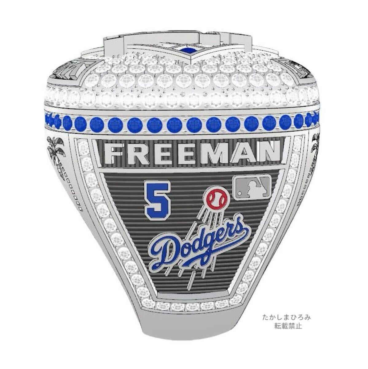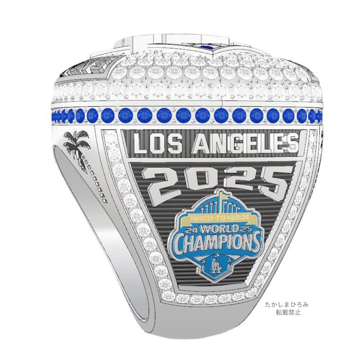 リング上部には「LA」ロゴ、側面には「2025」「Dodgers」「OHTANI」「背番号17」「YAMAMOTO 」「背番号18」「FREEMAN」「背番号5」などが細かく再現されており、2025年 MLB ワールドシリーズ優勝記念リング。