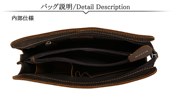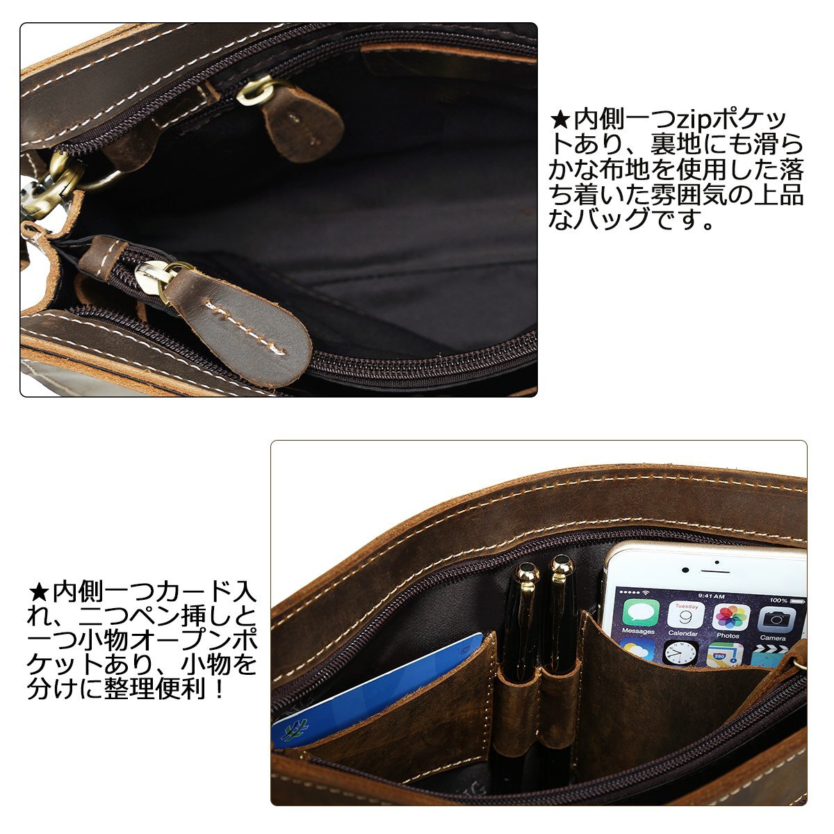コメント: 人気新シリーズ「アンティーク風バッグ」登場!今季人気新作最高級な本革レザー3wayセカンドバッグが新登場。このバッグは手頃なサイズで持ち運びやすいです。ストラップで手提げる時、使い込むほど馴染んで心地良くなっています。ビジネス時や着席時や運転時、手を離しても、椅子と床に置いた時もしっかりと自立するものが理想的です。思わず周囲の視線を集めてしまう、存在感あるセカンドバッグです!外出、ビジネス、運転中、デートなどに大活躍!非常に重宝です。気兼ねなく毎日でも使うことができます。また、外観は非常に小さく見えますが、収納性も抜群です。ストラップは着脱式です。 お手軽セカンドバッグとハンドバッグを腋にかかえる仕様と手持ちバッグを気分によって、変えられます。多機能なのが人気のセカンドバッグですね。バッグのフロント帽子のようなマッグボタンを開く、貴重品が入れても、超安心です。500mlペットボトル、折り畳み傘、携帯電話、デジタルカメラ、 財布など楽々余裕収納可能です。また、バッグのメインポケットは仕切りがありますので、物の出し入りは整理上手です。裏側にはファスナーポケットがありますね! たくさん荷物を入れる方も整理上手でとっても便利ですよ。また、ブラウン色で復古的な感じが漂っています。年齢問わず長く愛用されています。自分へのご褒美バッグや特別な方へのプレゼントに最適♪。全身厚手な本革製ですが、特にストラップを含む、厚手感のある素材が使用した落ち着いた雰囲気の高級なバッグです。また、バッグの真ん中にオリジナルブランド「TIDING]ロゴ印刻が押されています。限定生産で、全正規品です。お客様は絶好のチャンスがお見逃しなく!