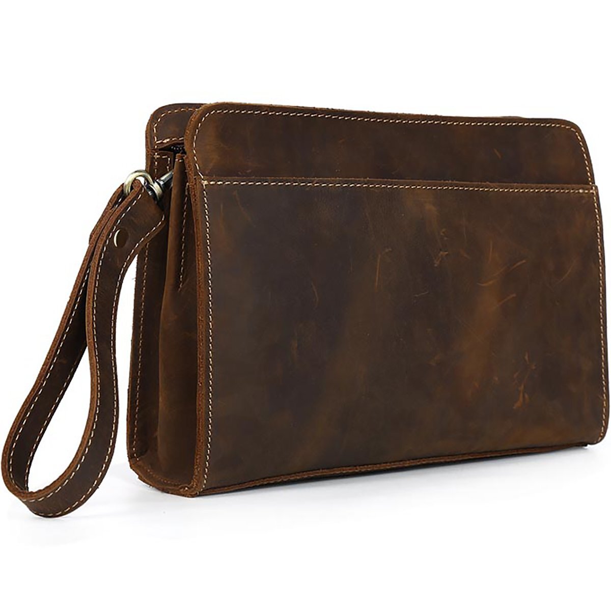 TIDING アンティーク風 本革 メンズ セカンドバッグ チェーン付き 厚手牛革 プルアップレザー 経年変化 ブラウン 潮牛
