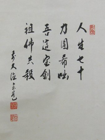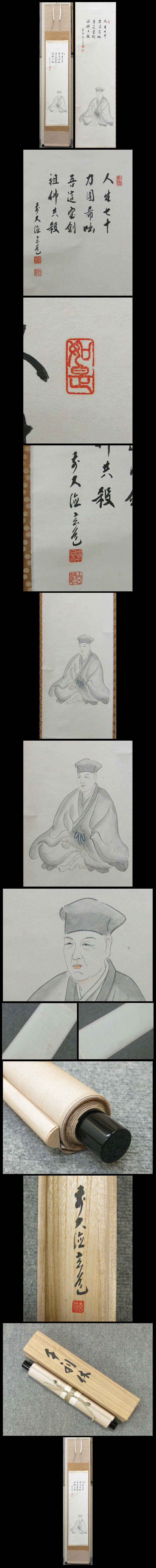 【須賀玄道】大正8年大分県杵築市生まれ。 元方広寺派管長足利紫山老師、元建仁寺派管長竹田頴川老師に就いて修行。 昭和22年瑞泉寺住職となる。大徳寺派布教師に任命されすでに三十余年の巡教歴がある。 ★商品サイズ★ ■掛軸 175×30cm ■作品 99×28cm ★商品の状態★ 作品にわずかな薄じみがあります。顔の近くにあるものは紙に交じった糸のようなものです。 裏側にわずかなしみ汚れがあります。 ご承知のうえご入札をお願いします。 時代など詳しくは画像にてよく確認のうえでご検討いただければと思います。 どうぞよろしくお願いいたします。 |