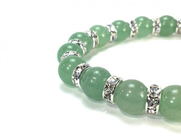 こちらは、10mm玉のアベンチュリンを使用したパワーストーンブレスレットです。間にはロンデルを挟み高級感あるブレスレットに仕上げています。石大きさは腕にも馴染みやすいように10mm玉を使用して、サイズは内径約18cmです。(サイズ調節も無料で承っています。サイズ変更の場合は落札後、取引ナビにてご一報くださいませ。) 数に限りがございますので気になる方はお早めにどうぞ。