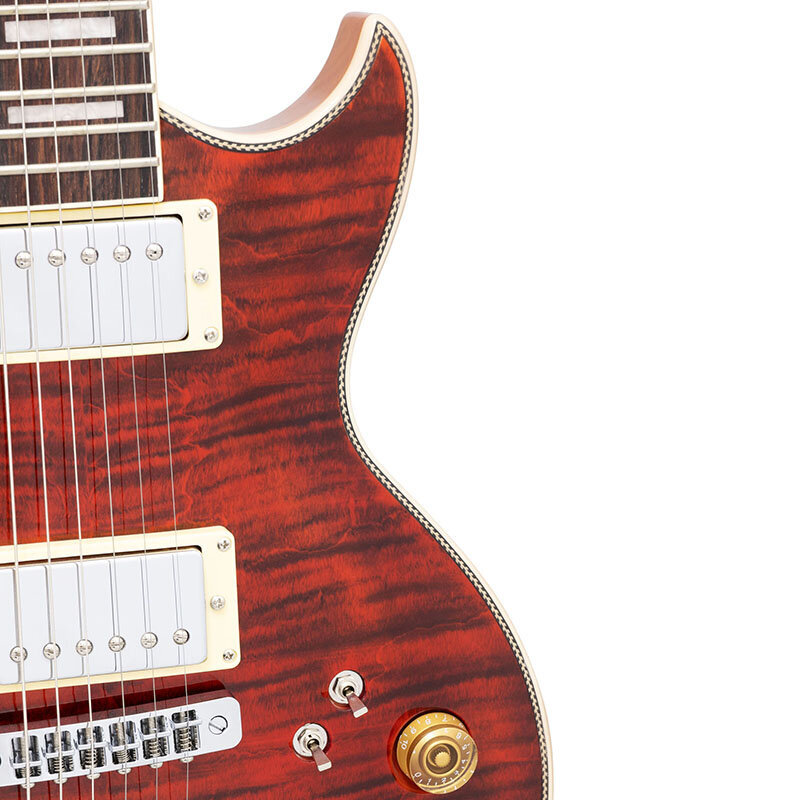 美しいフレイムメイプルトップにヘリンボーン・パーフリングを採用。