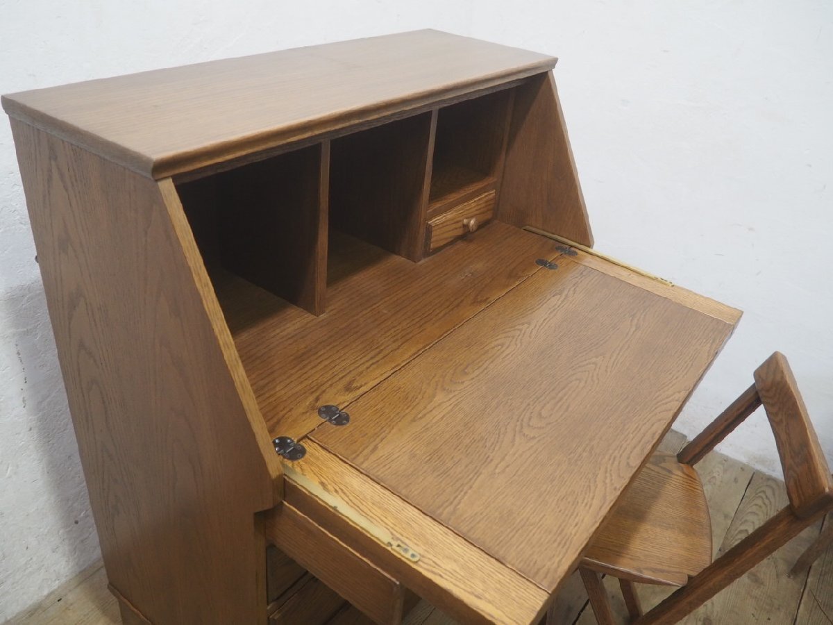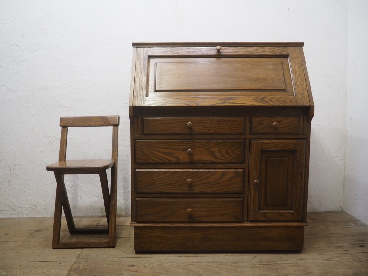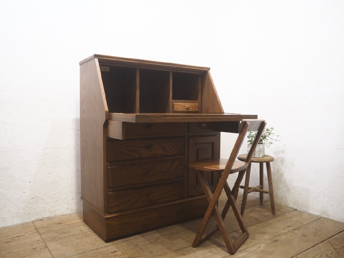 タ荷P0686◆H111cm×W91cm◆椅子付き◆希少デザインの古い木製ライティングデスク◆机 テーブル イス 飾り棚 ビューロー レトロP(ヤD)松