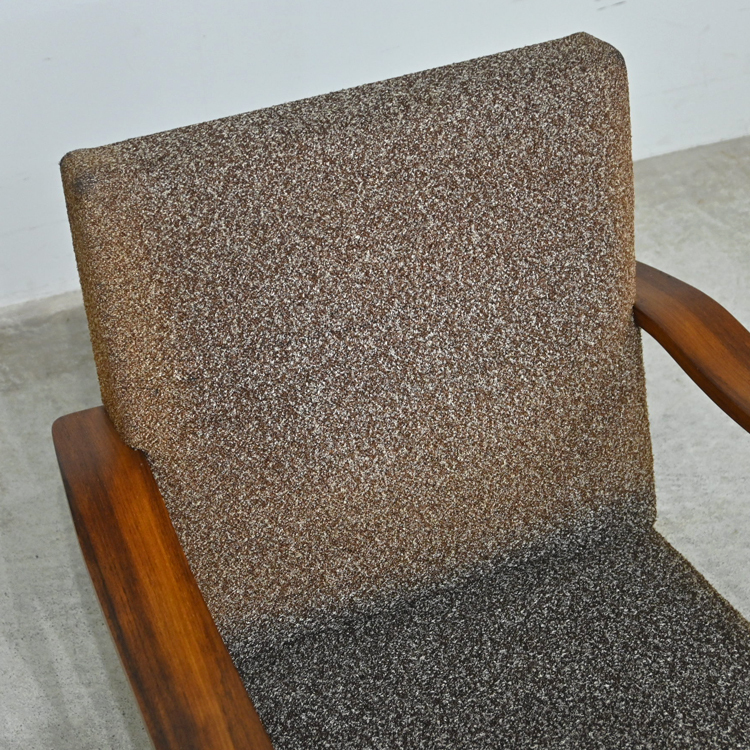 脚にはビーチ無垢材、シートの張り地はオリジナルと思われ、当時の雰囲気が味わえるブラウン系のファブリックが使用されています。