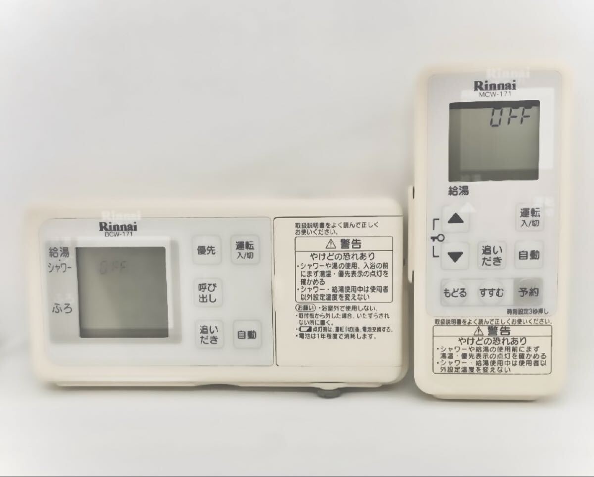リンナイコードレスリモコンの浴室、台所の中古セットです。作動確認済み。使用前に受信部との簡単なID登録が必要です。説明書を同封します。