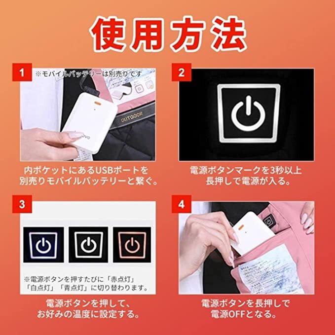 【注意】本製品はバッテリーが付属しておりません。電熱機能を使用するには、5V/2A以上のUSB出力を備えた市販の充電式モバイルバッテリーを別途ご用意ください。