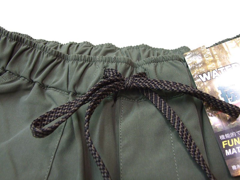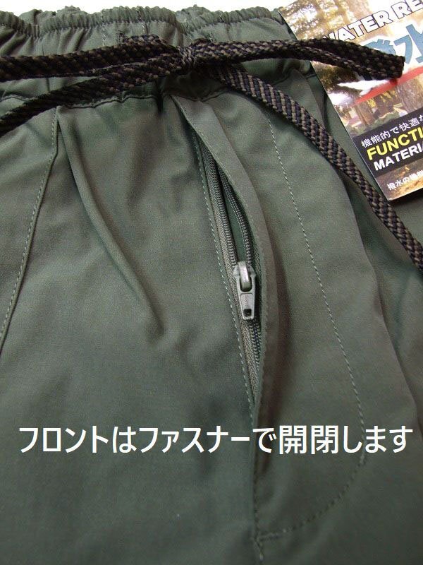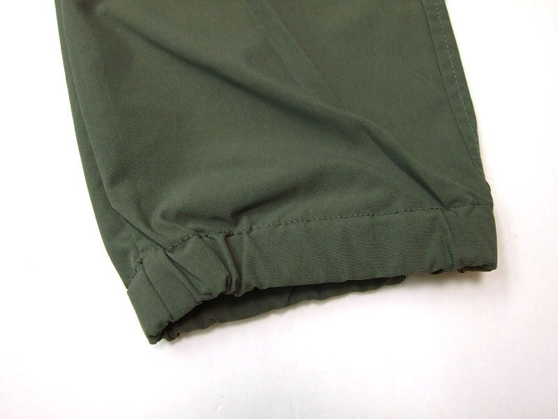 フロント開閉はジップ式。ウエストはゴムで伸縮する機能性に長けたディテール。裾はゴムで伸縮します。