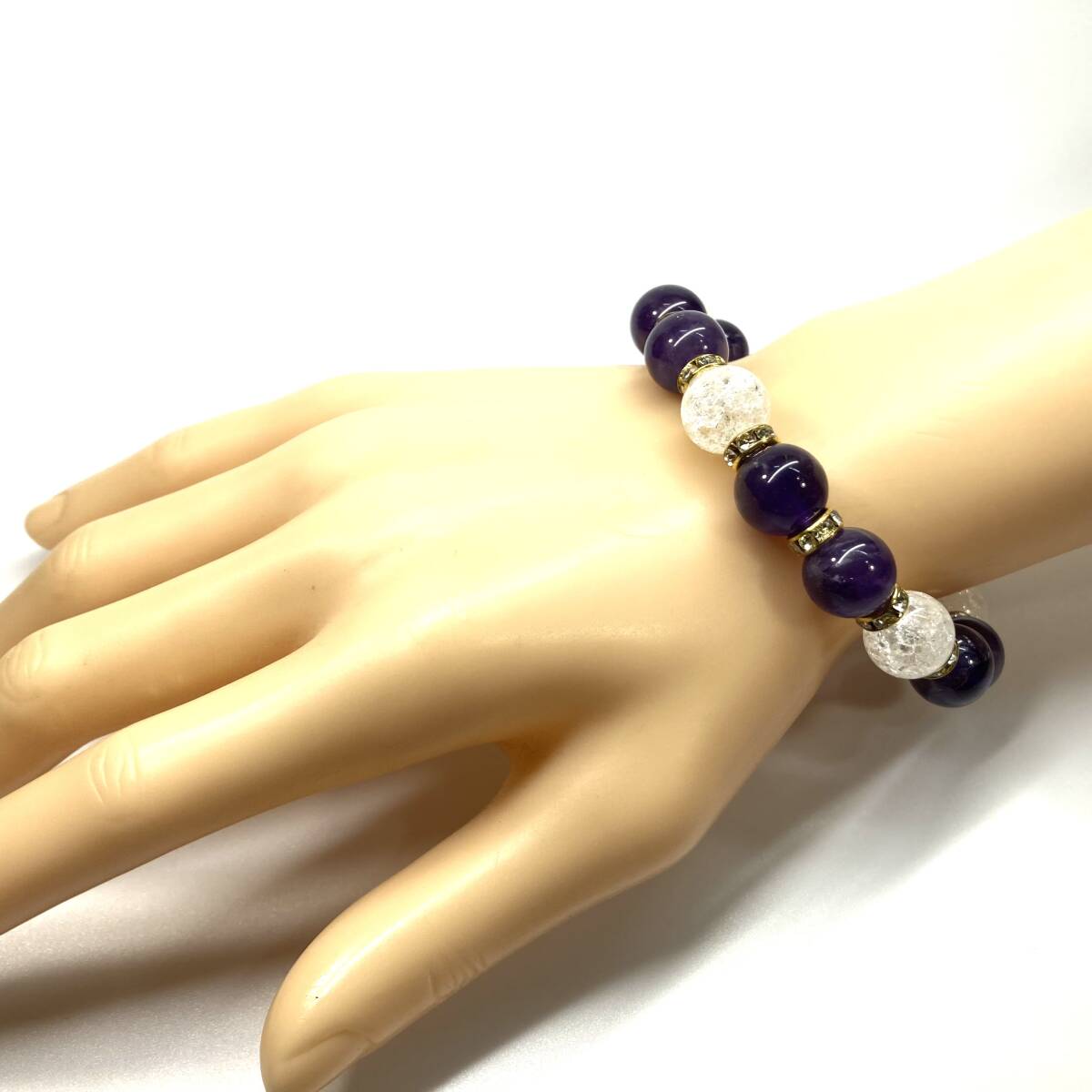 こちらは、クラック水晶とアメジストを組み合わせたパワーストーンブレスレットです。間にはロンデルを挟み高級感あるデザインに仕上げております。石大きさは12mm玉を使用して内周約18cmです。気になる方は是非この機会にどうぞ。