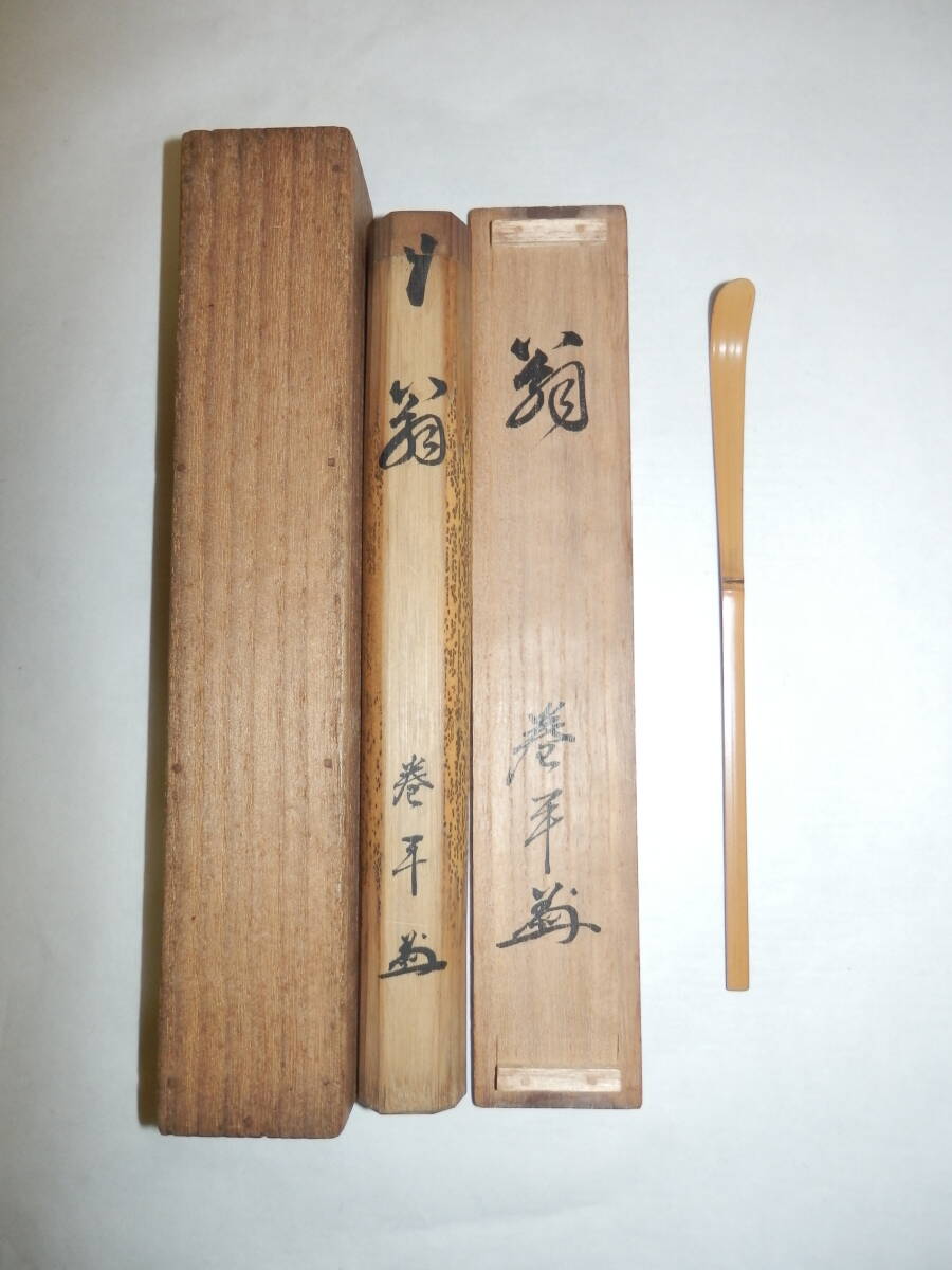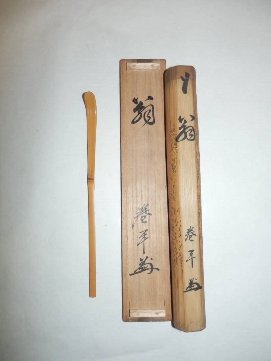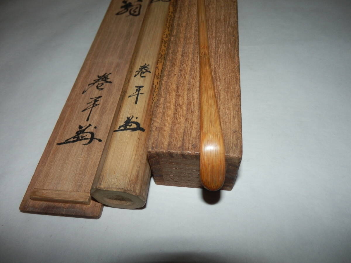 「中古品・茶道具」巻平さんの茶杓です。銘「翁」です。 茶杓長さ約17.9cm 竹筒・桐共箱「ヤケ、シミ等有」。 どうぞ宜しく。