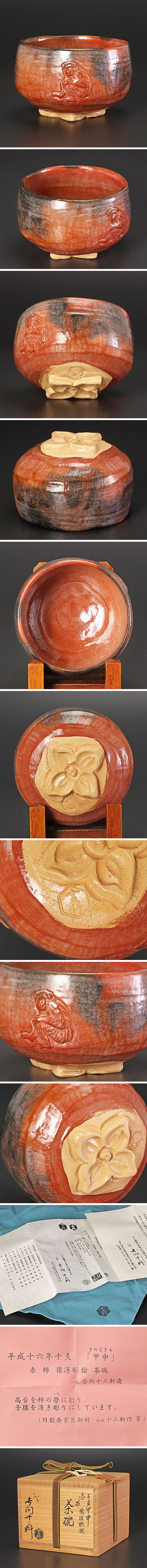 | 【古美味】八代吉向十三軒 干支甲申猿浮彫絵 赤柿茶碗 茶道具 保証品 |