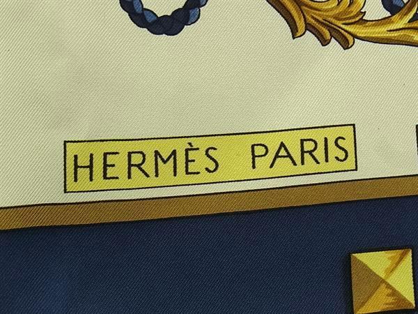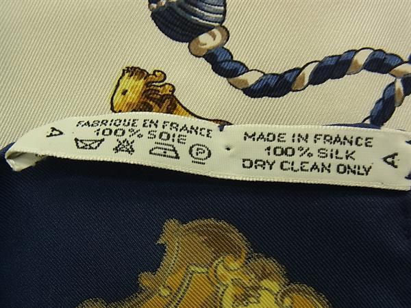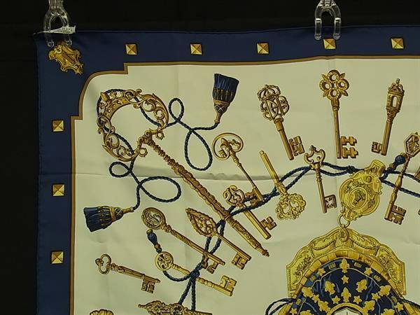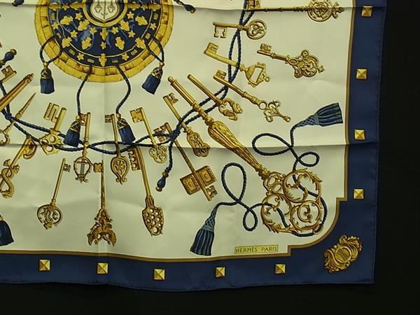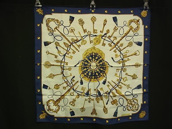 1円 ■美品■ HERMES エルメス LES CLES【鍵柄】カレ90 シルク100% 大判 スカーフ ストール ショール アイボリー系×マルチカラー FN9483