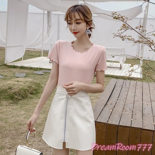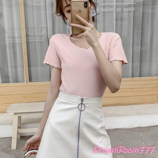 Solid color ラウンドフリル Tシャツ XLサイズ 美ライン 半袖 レディース オフィス カジュアル 無地 綺麗め K-088-3ピンク