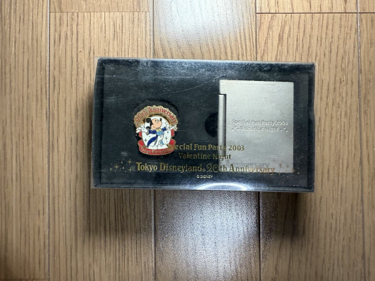 このセットは、2003年のバレンタインナイトイベントを記念して作られたもので、特別なデザインが施されています。ピンバッジには20周年のロゴとミッキーマウスが描かれており、時計には「Special Fur Party 2003 Valentine Night」の文字が刻印されています。