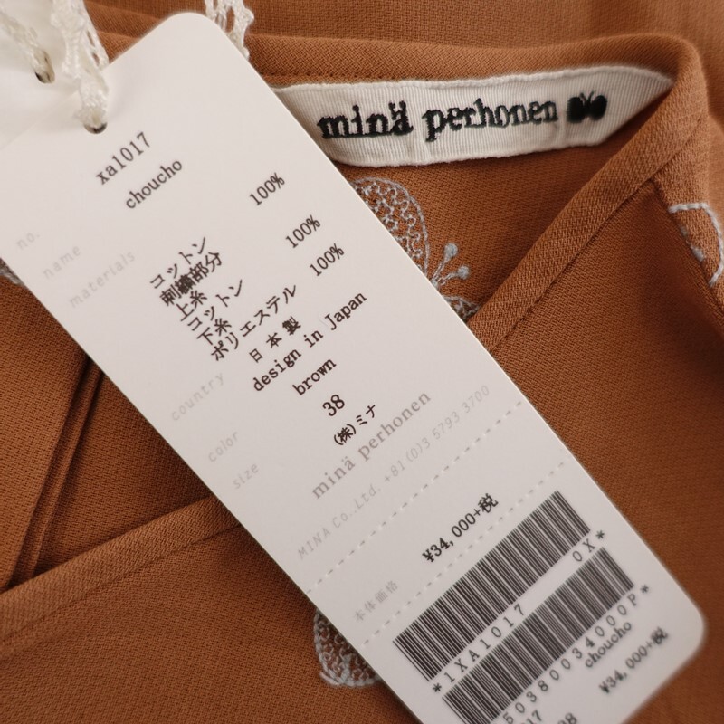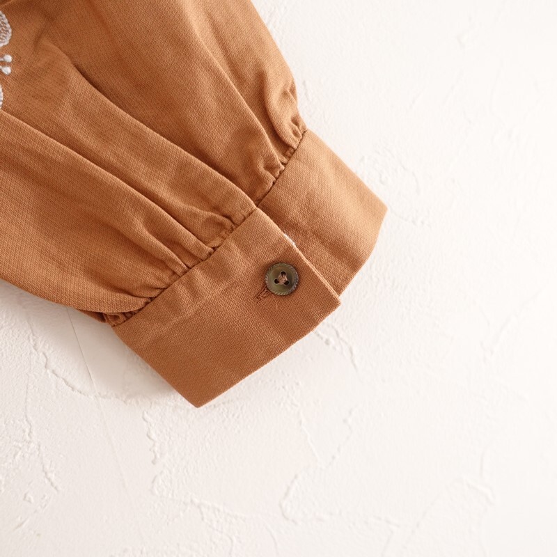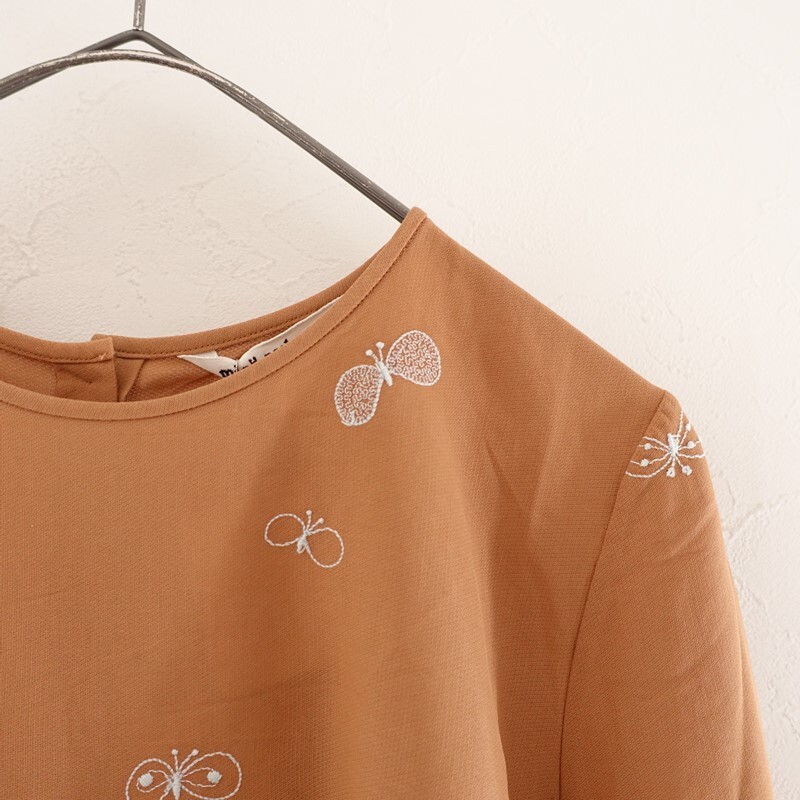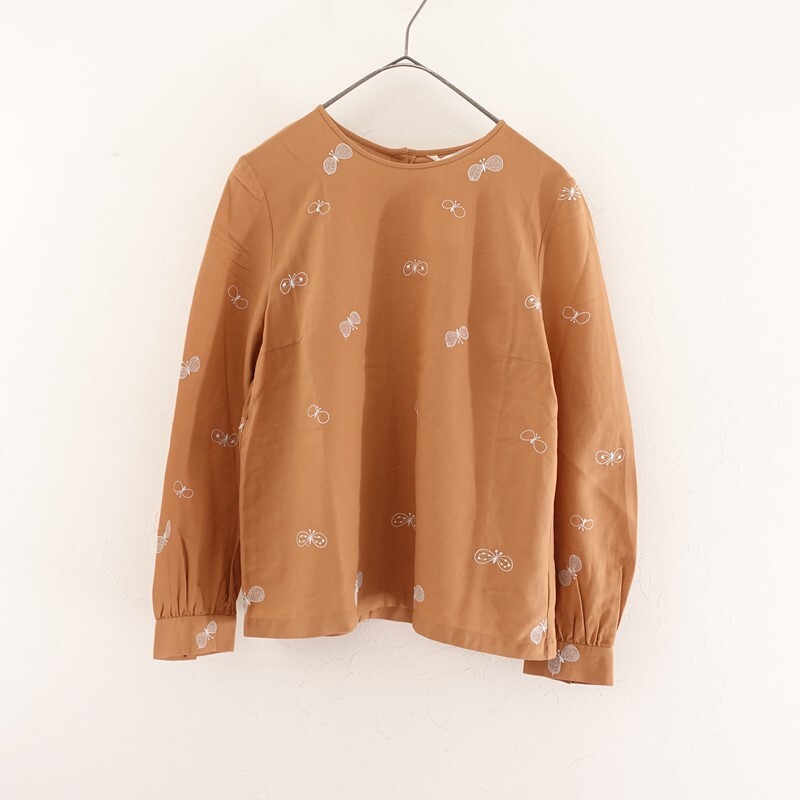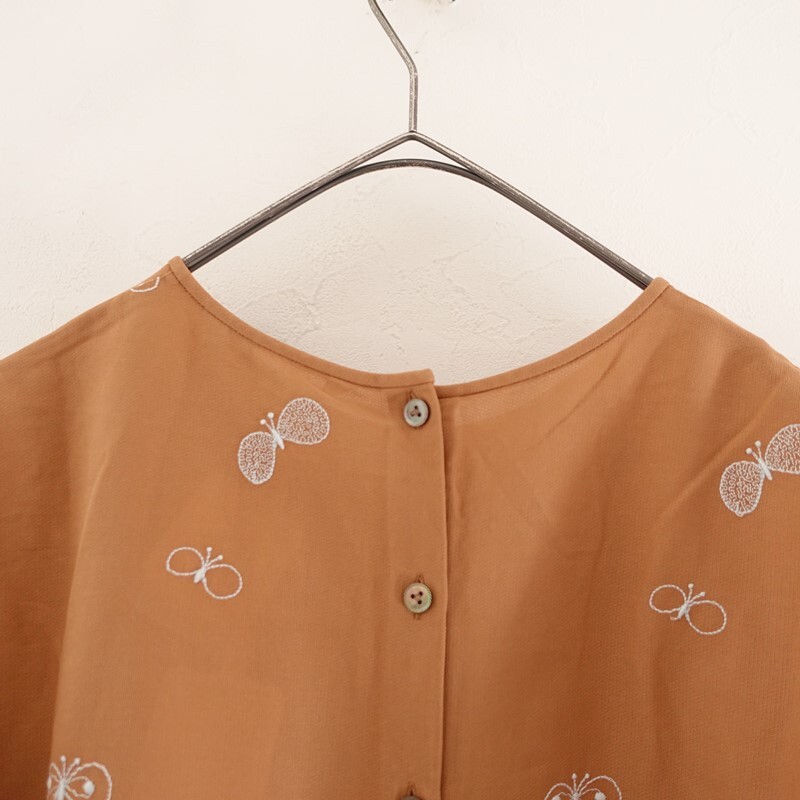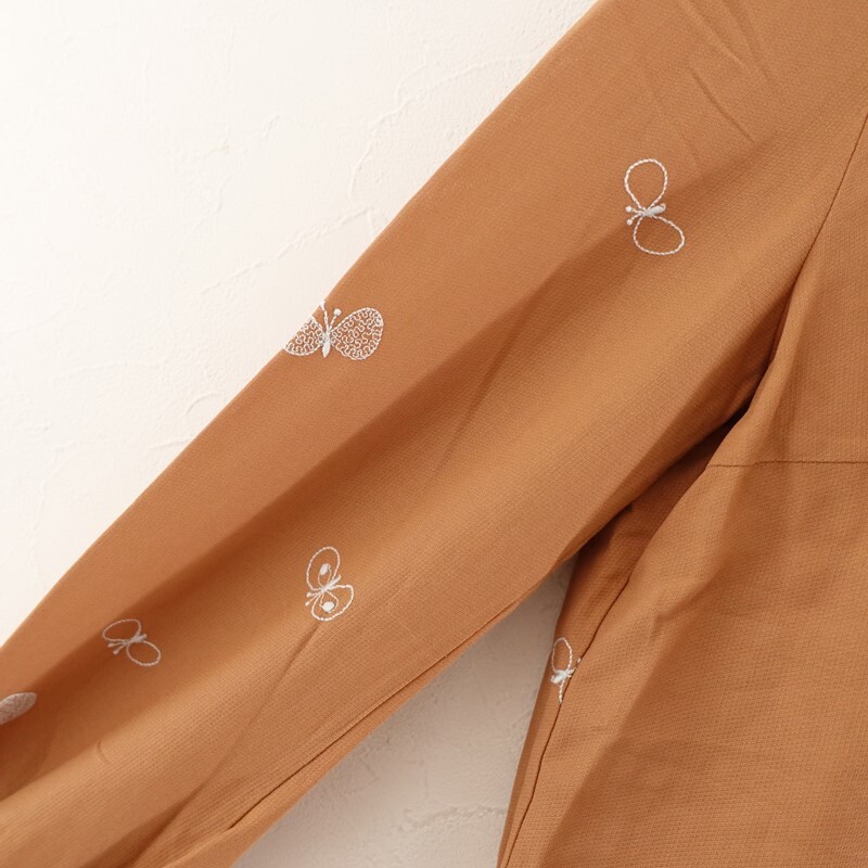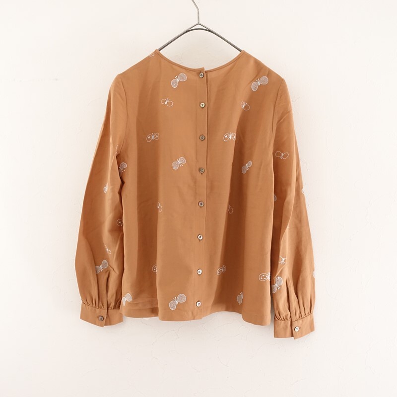 | mina perhonenのchoucho 刺しゅう背開きブラウスです。カラーはブラウンにライトグレーの蝶刺しゅう入りで、シボのある薄手の綿素材です。袖口にギャザー入りで、後ろ&袖口ボタンで着脱できます。定価(メーカー希望小売価格)37,400円の商品です。 |