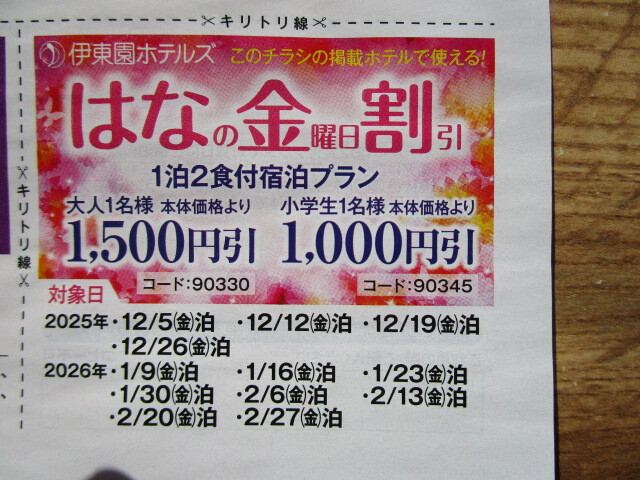 新聞折込チラシに載っておりました伊東園ホテルズの割引券です。