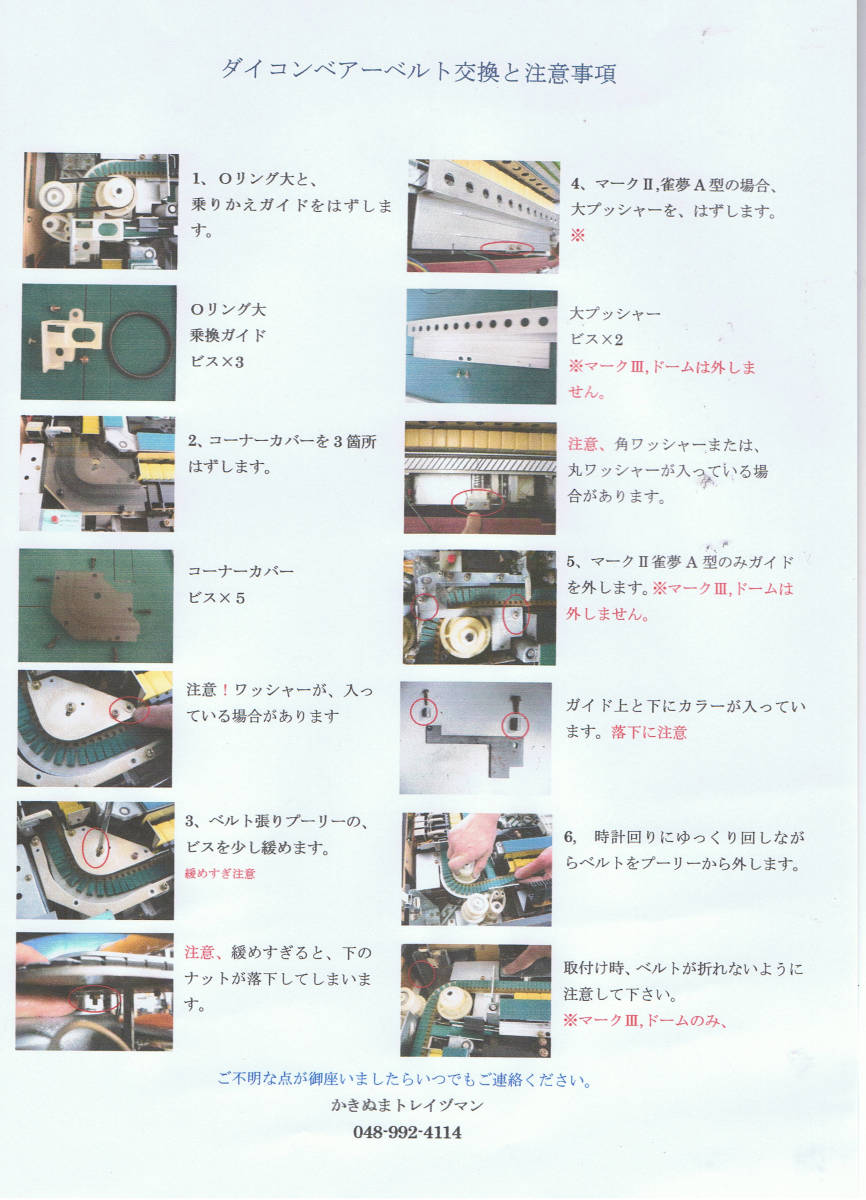 | ◆商品説明◆ | 対応機種 雀夢A、マークⅡ、マークⅢ、雀豪マークⅢ、ドーム、 画像3は、純正ベルトですが製造中止のようです、同サイズですので使用可能です。 この機種の開発時ダイコンベアーベルトによるトラブルが多く大変苦労しましたが、15年前自社埼玉県で製作し販売させていただいております。 200以上は、販売させて頂きました。 上面の牌に触れる部分は、樹脂(グリーン、グレー色)を使用しているため湿気(牌の汚れ)などにも滑りが良く安定しています。 細かなカットも角度をつけベルトに対する負荷を少なくしてあります。 裏面はテフロン加工(スプレーにて)してありますので、見た目に多少のむらがございます。 手作りの為製作時の多少の傷、汚れ、歪み等ございますが、使用には問題ございません。 |