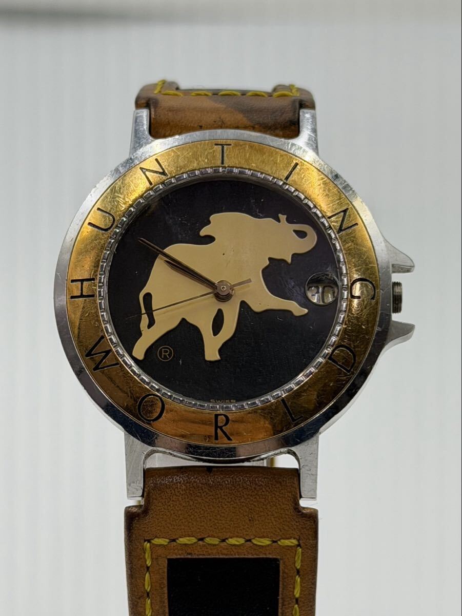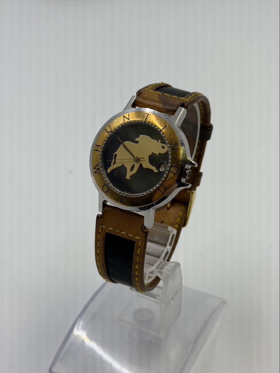 ☆不動品 ハンティングワールド HUNTING WORLD HWL12/1154 クオーツ デイト 18K GOLD BEZEL 腕時計 メンズ 総重量46gになります。