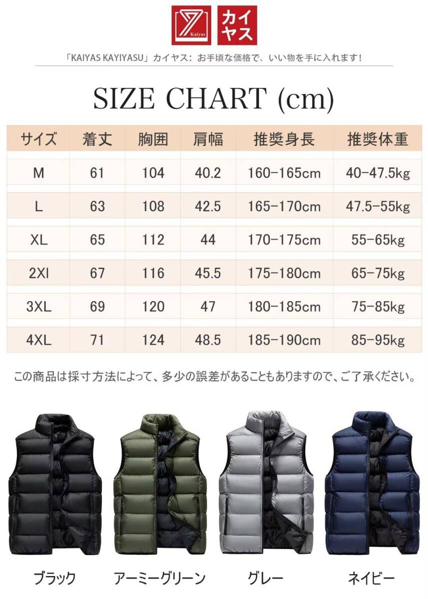 「中綿 デザイン」このダウンベストは立ち襟デザインを採用し、裾口と袖口の内側にもゴム入りで、冷たい空気の侵入を効果的に防止し、暖かさを保ちます。メンズベストは深みのある四つポケットがあり(両脇ファスナー付き二つと内側に二つ)、寒い時ポケットに手を入れて暖かくなる、鍵やカードケース、財布や携帯電話みたいな小物にも収納出来ます。