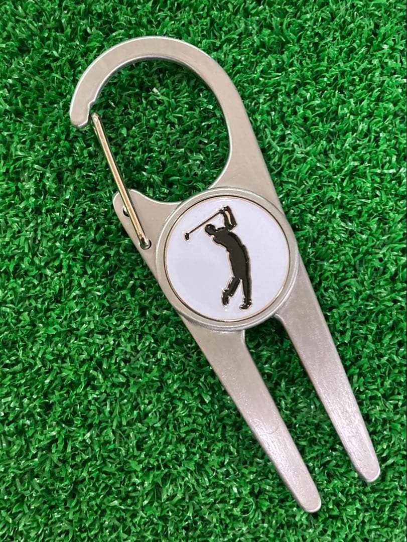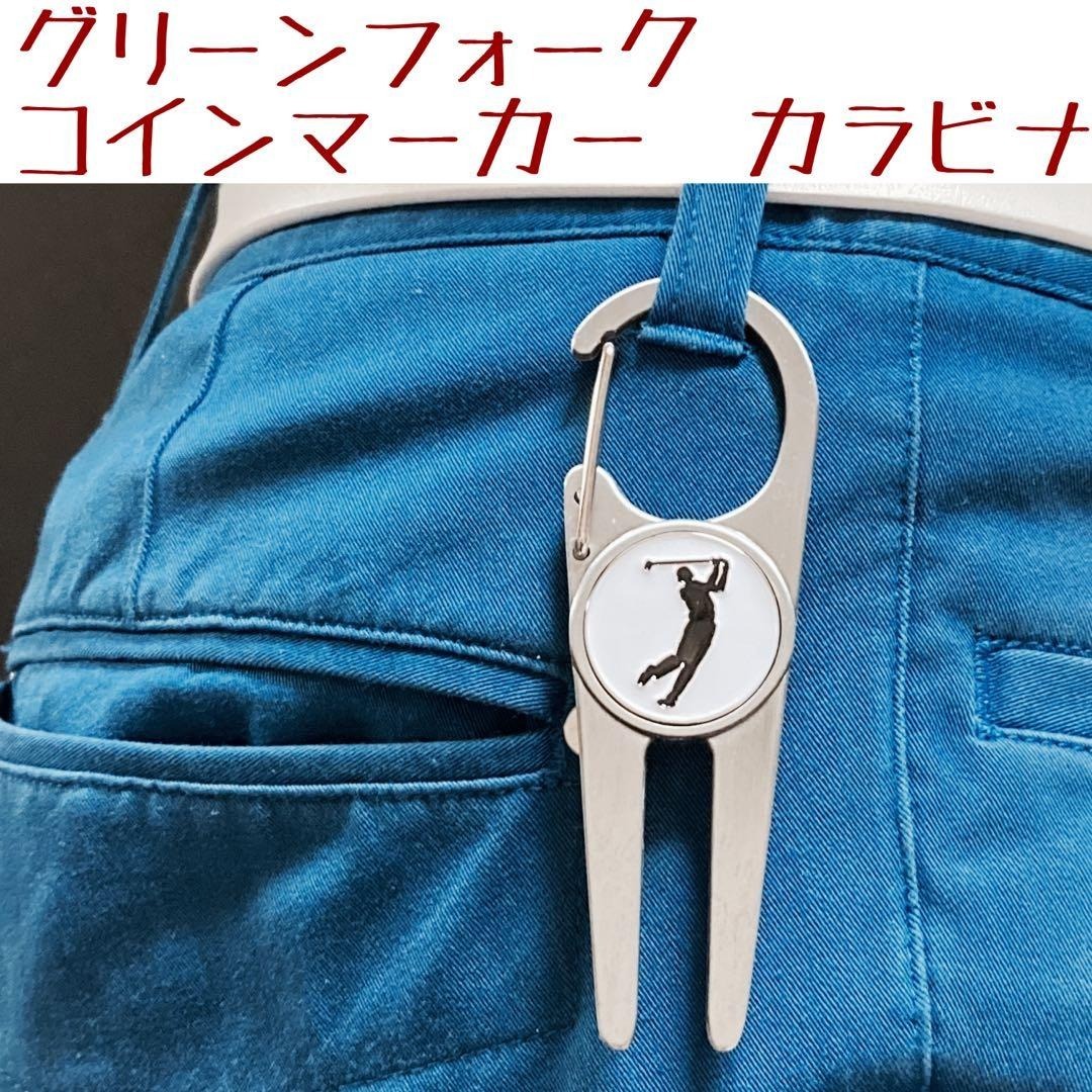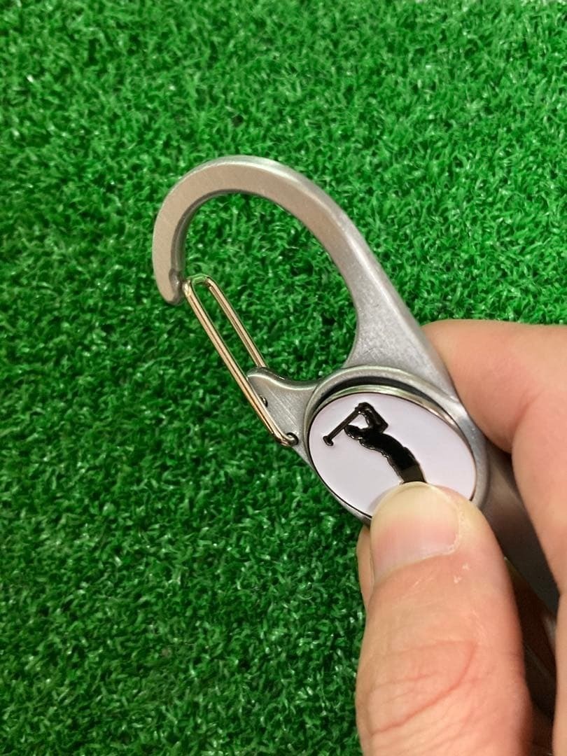 グリーンフォークとボールマーカーが一体となった商品です。更にカラビナ式ですのでポケットに入れる必要も無くゴルフパンツに引っ掛けるなど出来、大変便利になっております。