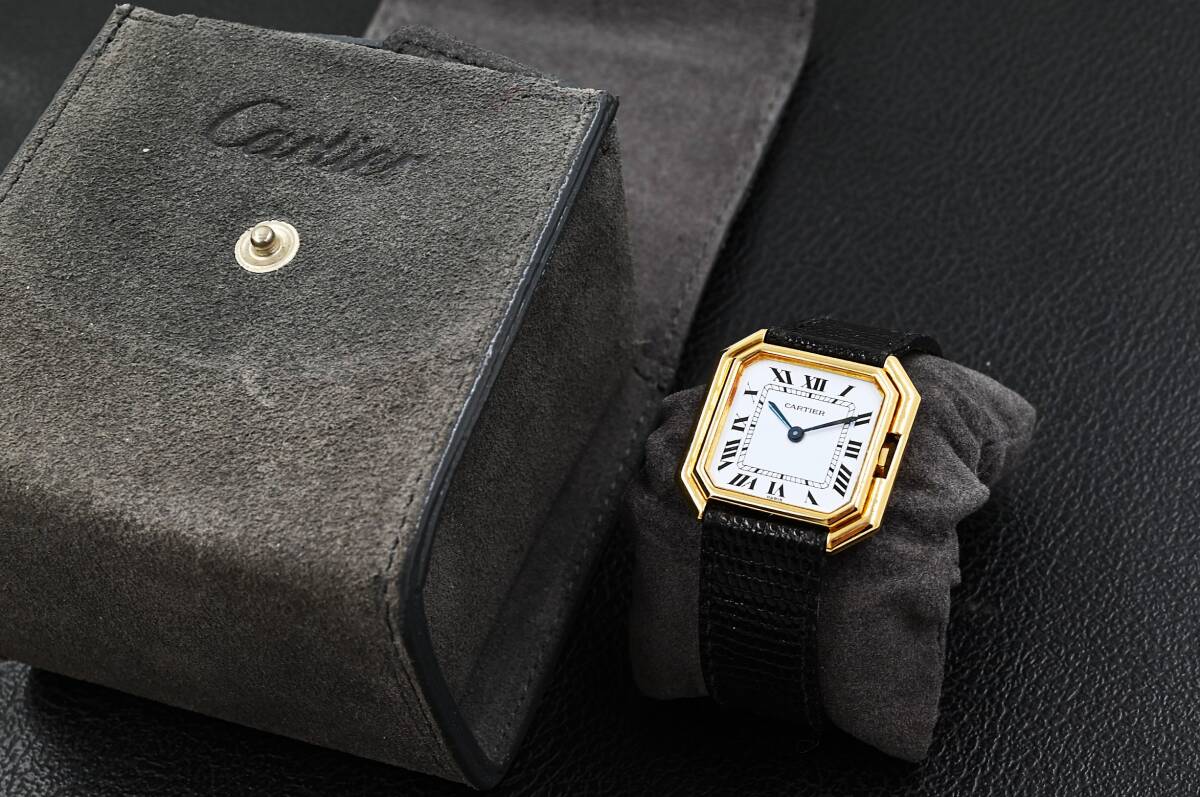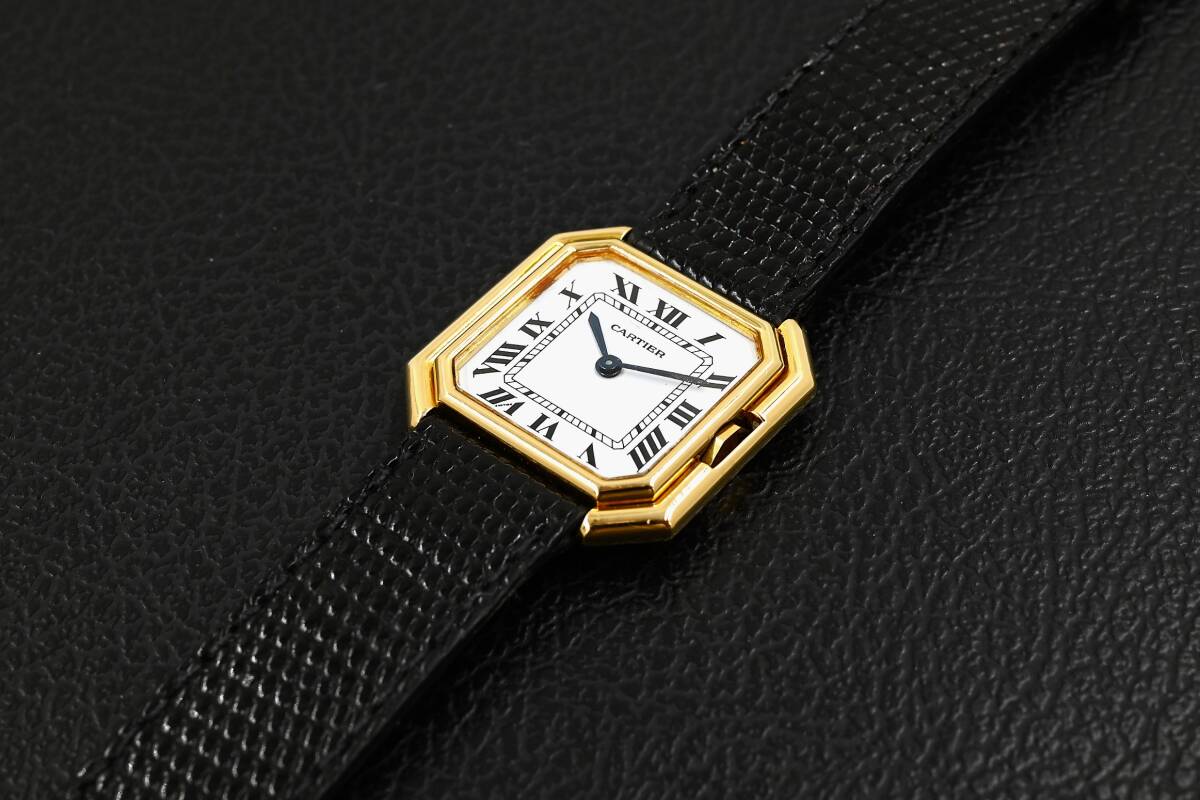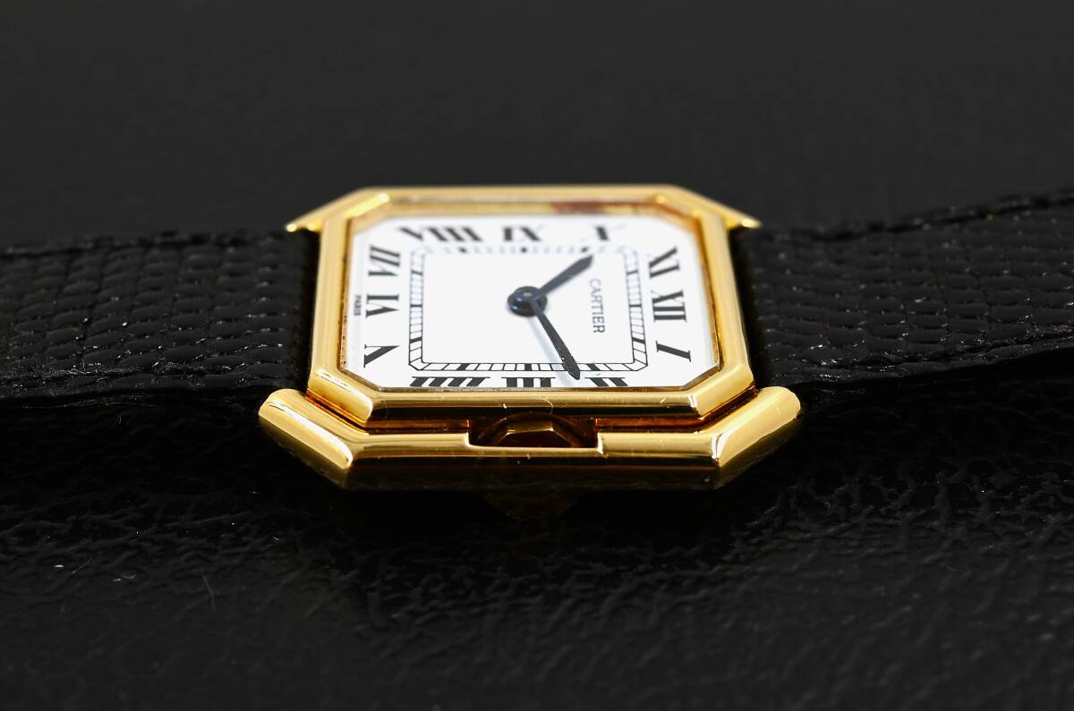 カルティエの手巻き、サンチュール Paris表記のビンテージ時計になります。1970年代に登場したカルティエの人気モデルであり、リューズを内側に収めた2重ベゼルのオクタゴンケースデザインが他に類を見ない特徴です。