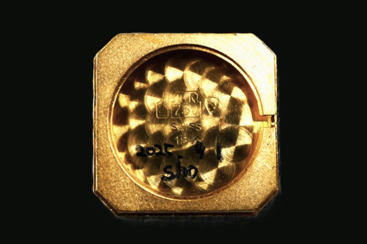 前述の18KYG金無垢ケースは2重ラインが美しいオクタゴンフォルムで、裏蓋の刻印やホールマークは鮮明で研磨感も皆無です。