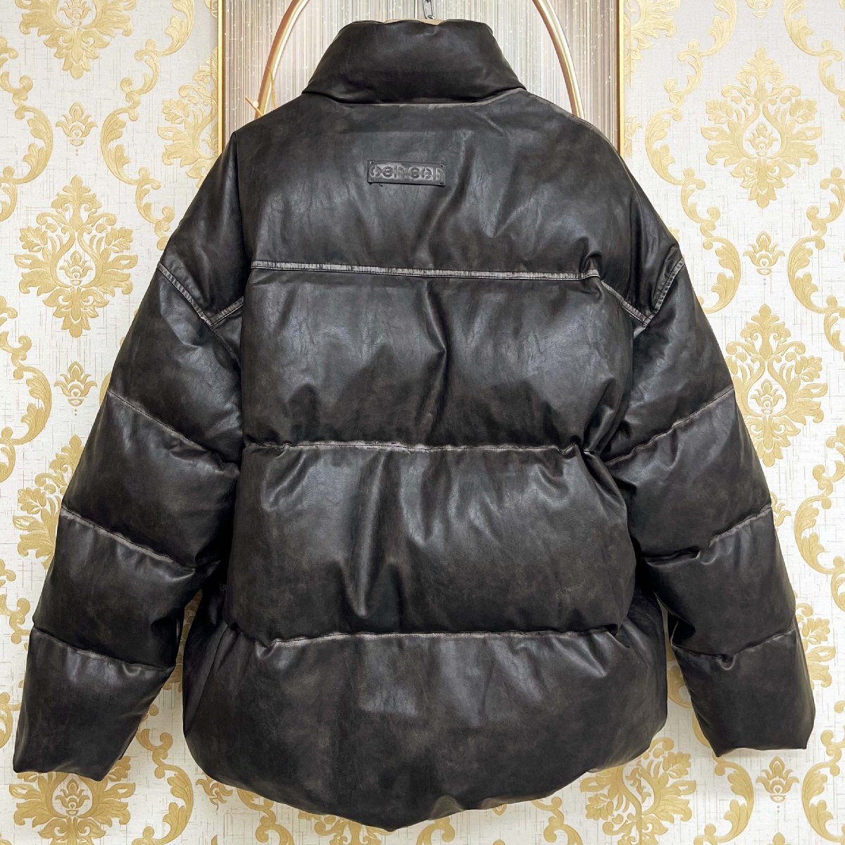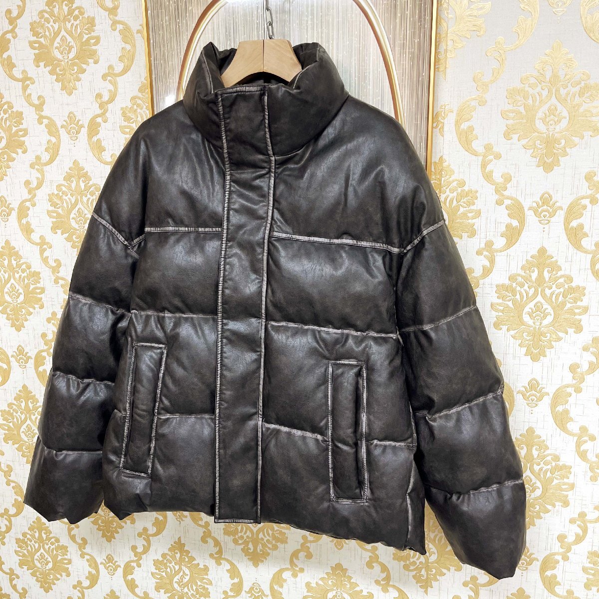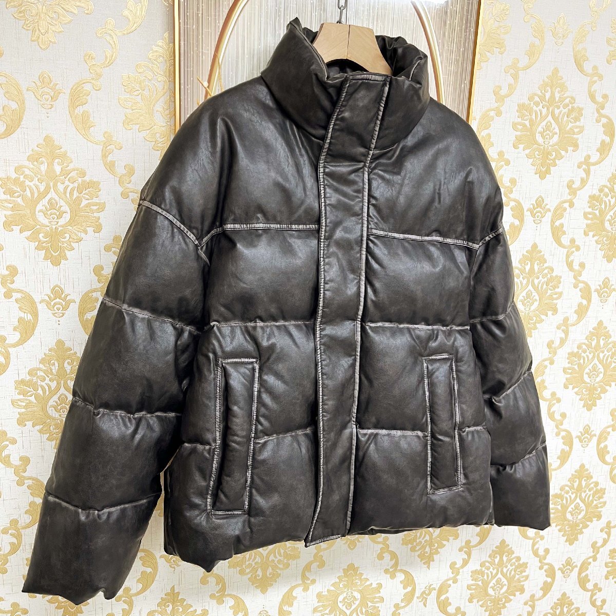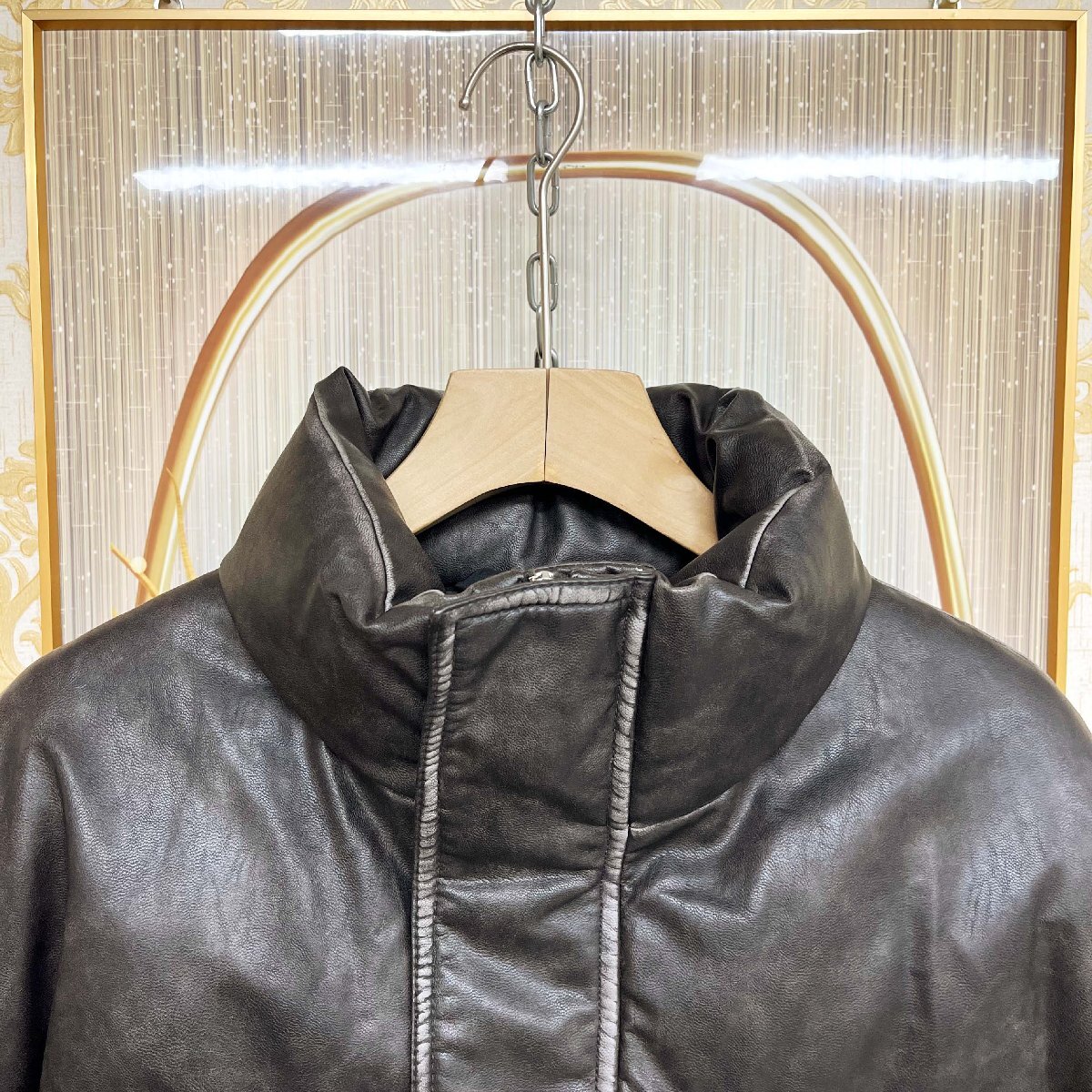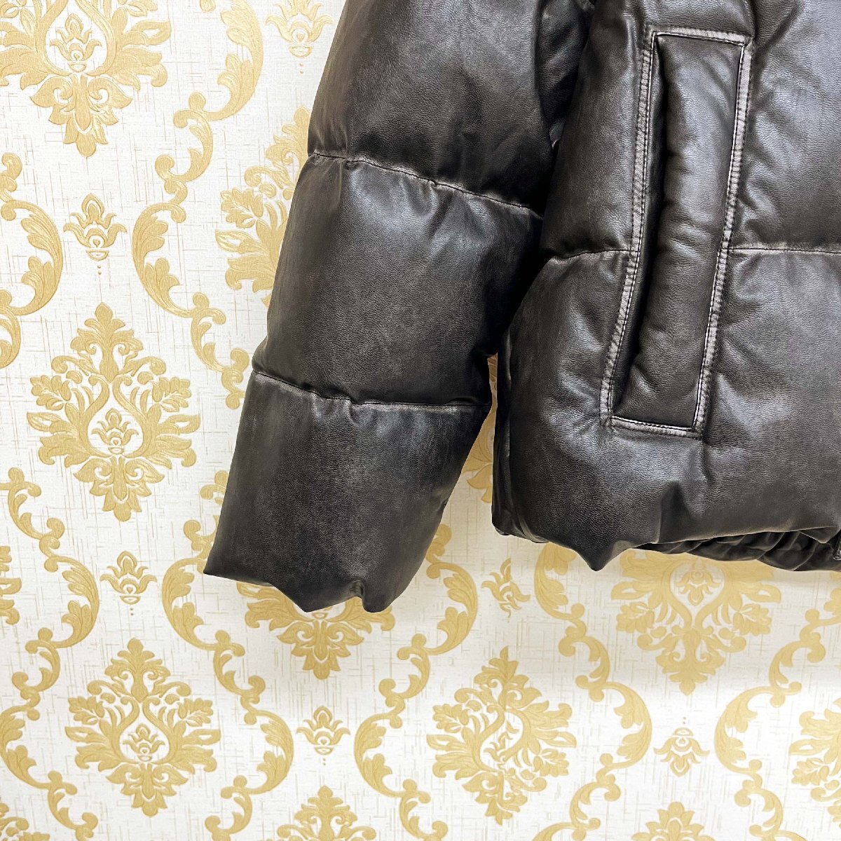 外側にはしっとりとしたレザー風素材を使用し、控えめな光沢で高級感を引き立てています。内部には中わたグース90%フェザー10%を採用し軽さとぬくもりを両立した快適な着心地を実現しています。