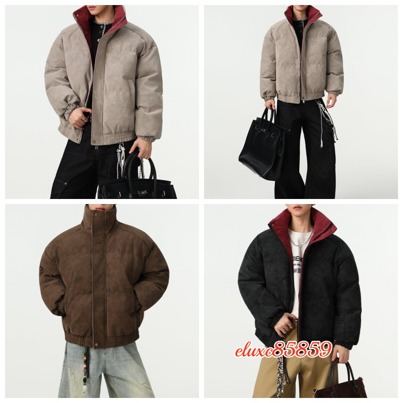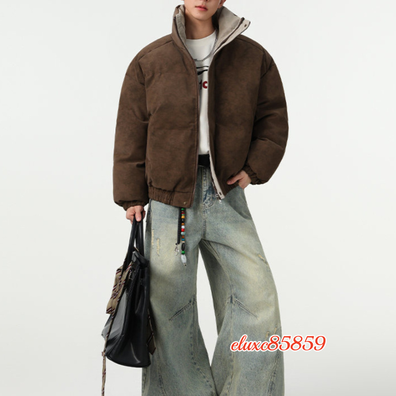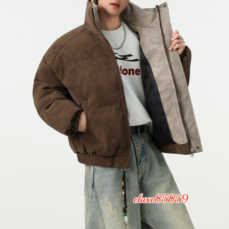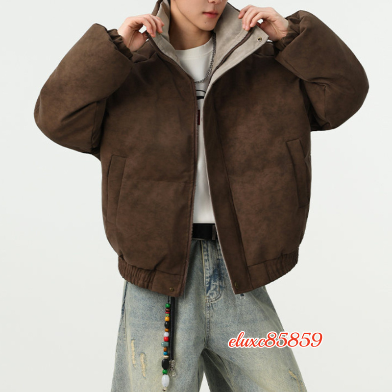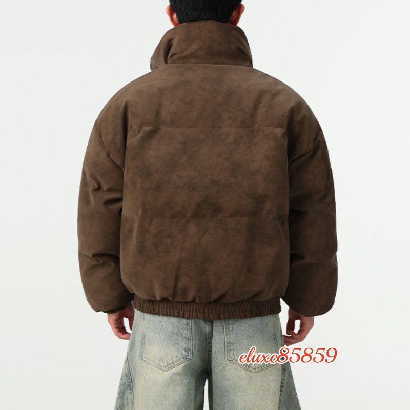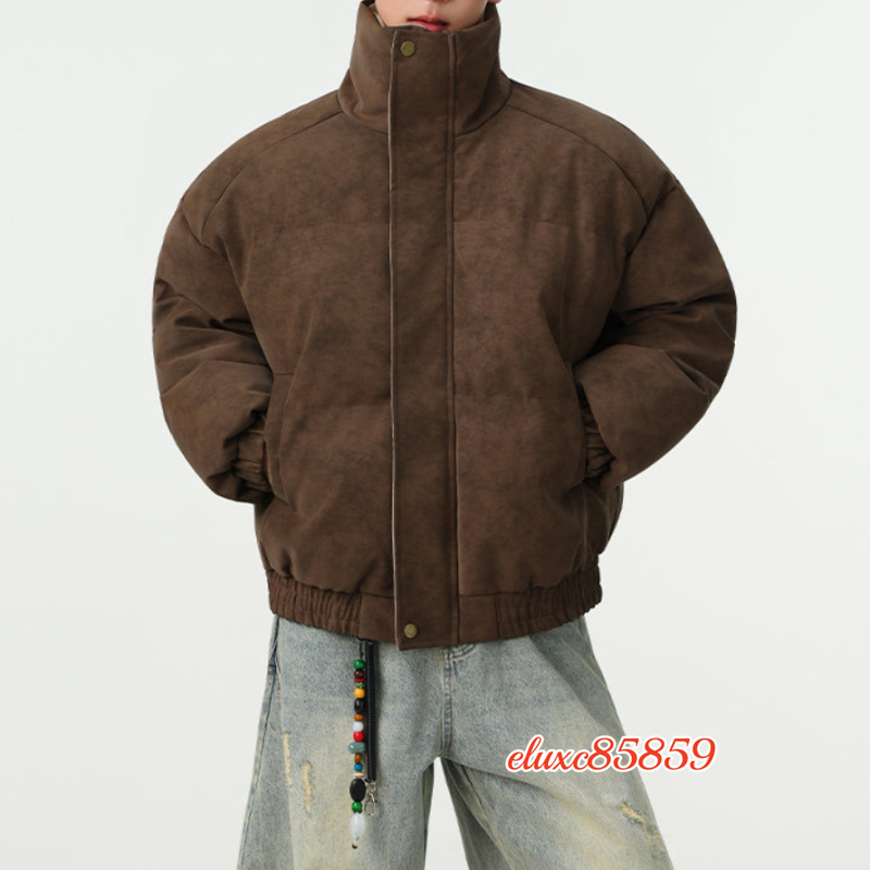 メンズ ダウン綿ジャケット PUレザー キルティング だぼっと アメリカンカジュアル モッズコート ニットカラー 厚手 アウター XL 珈琲色