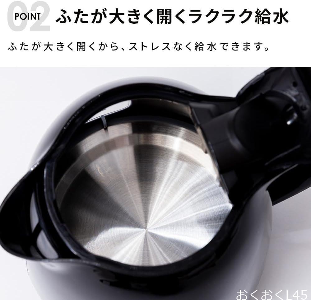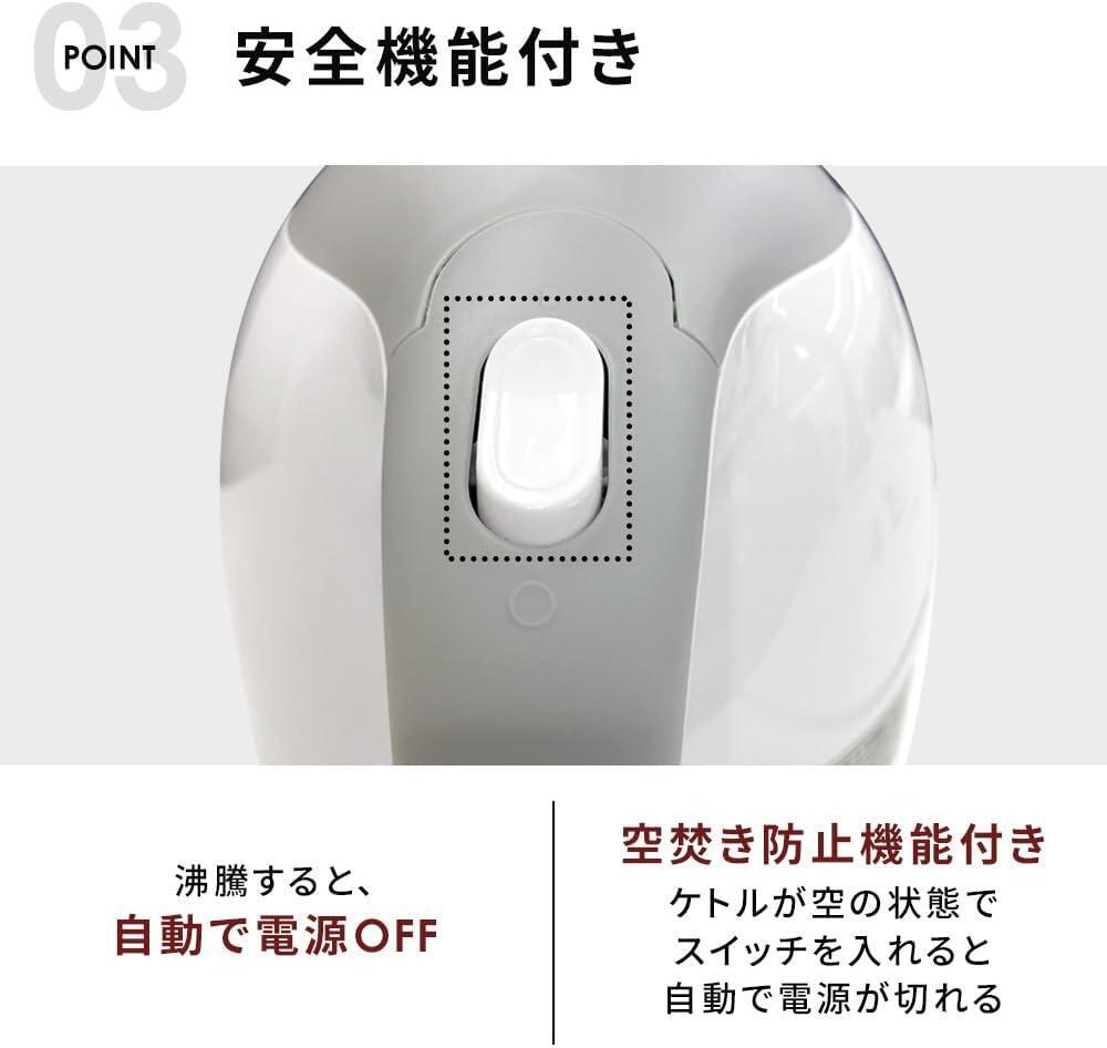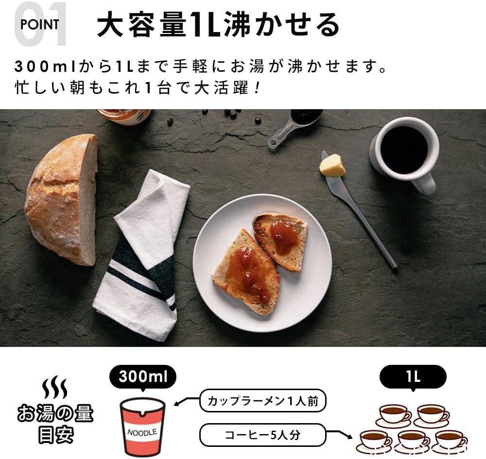 最大容量は1000mlでたっぷりお水を沸かす事ができます。300mlからでも沸かす事ができるので、一人前のカップラーメンや5人分のコーヒーまで使用する事ができます。